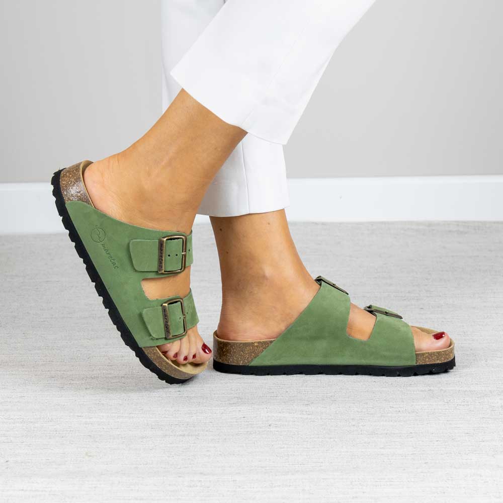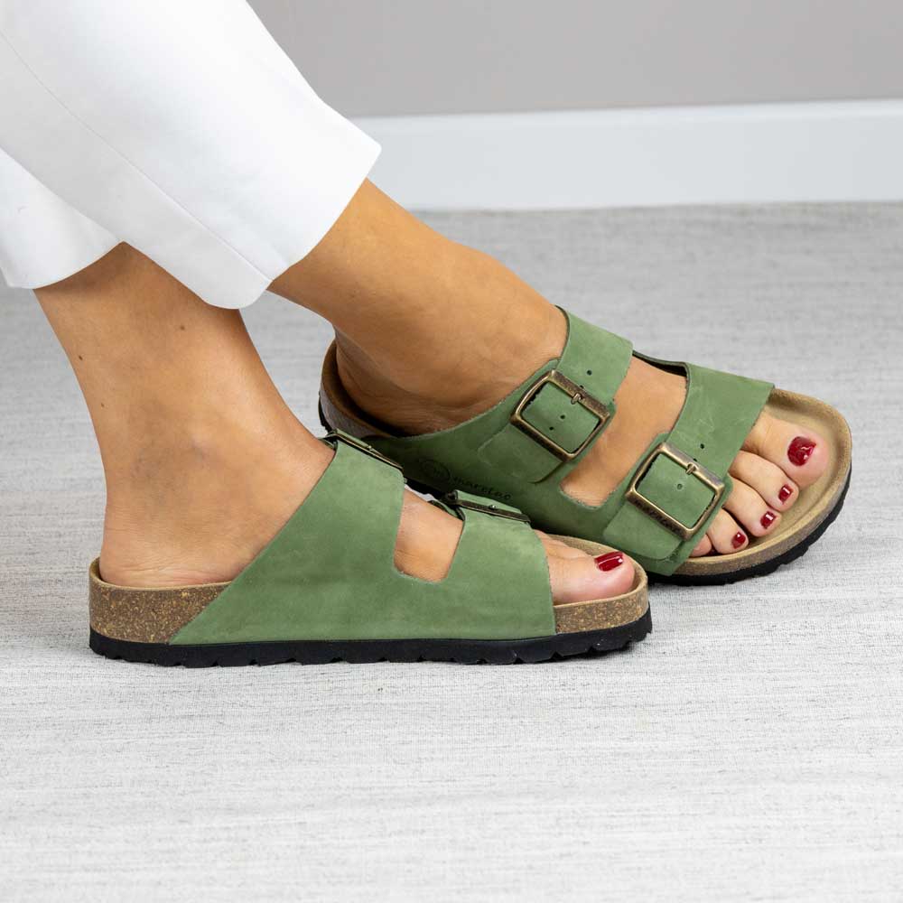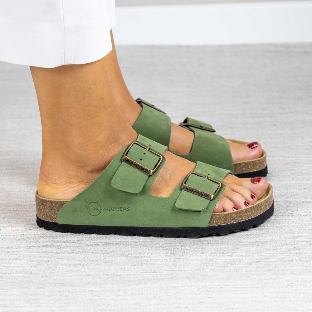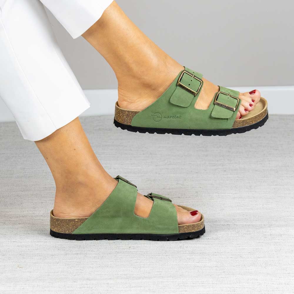 Suela de EVA antideslizante, flexible, junto con el Corcho amortiguan los pasos y protegen las articulaciones