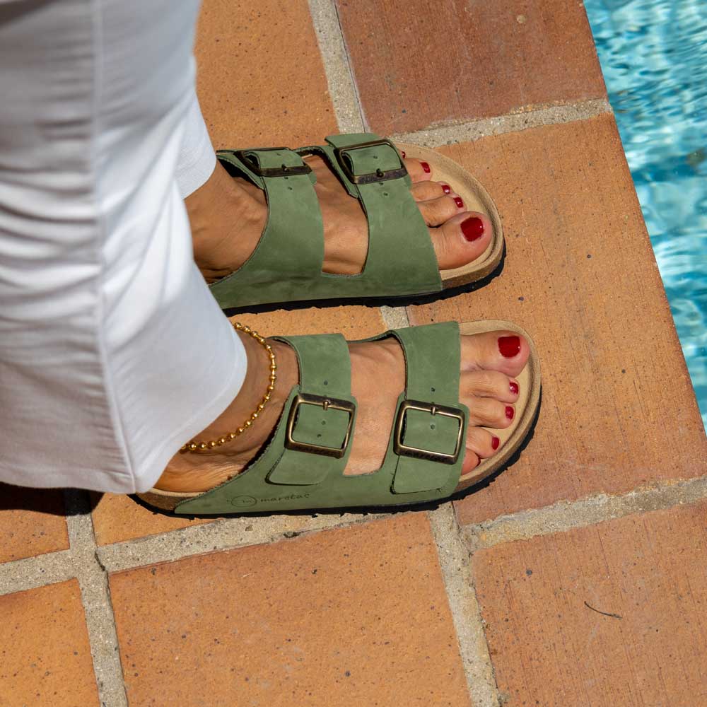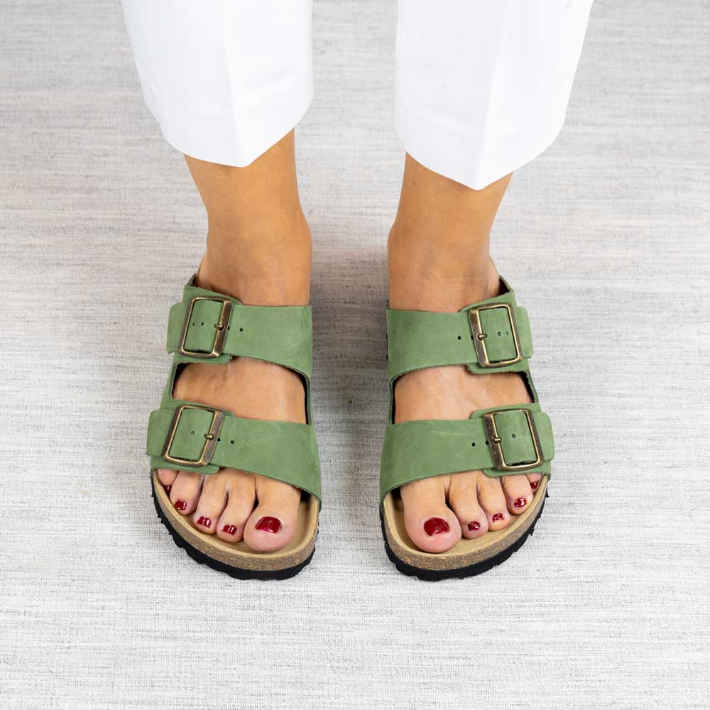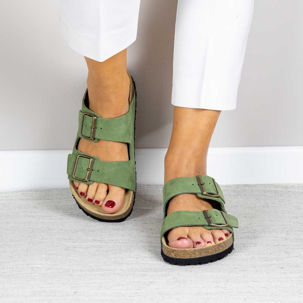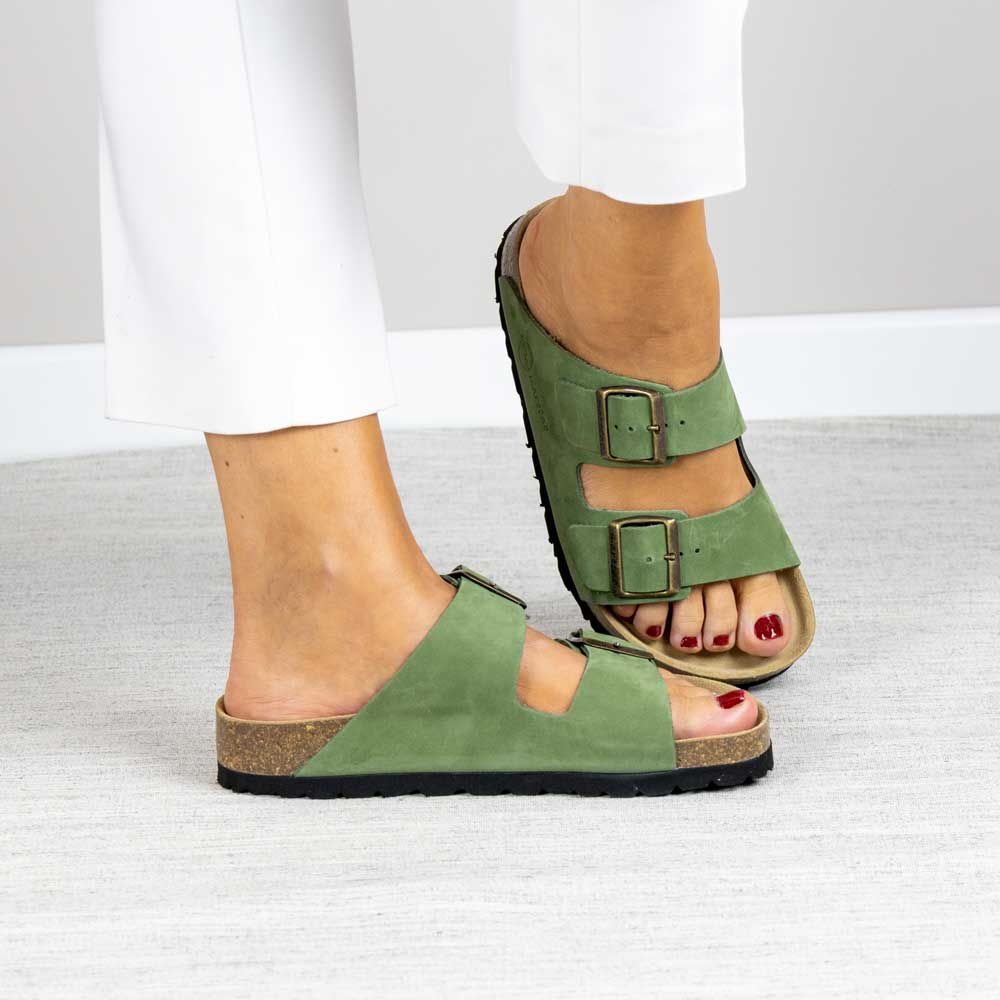 Suela de EVA antideslizante, flexible, junto con el Corcho amortiguan los pasos y protegen las articulaciones