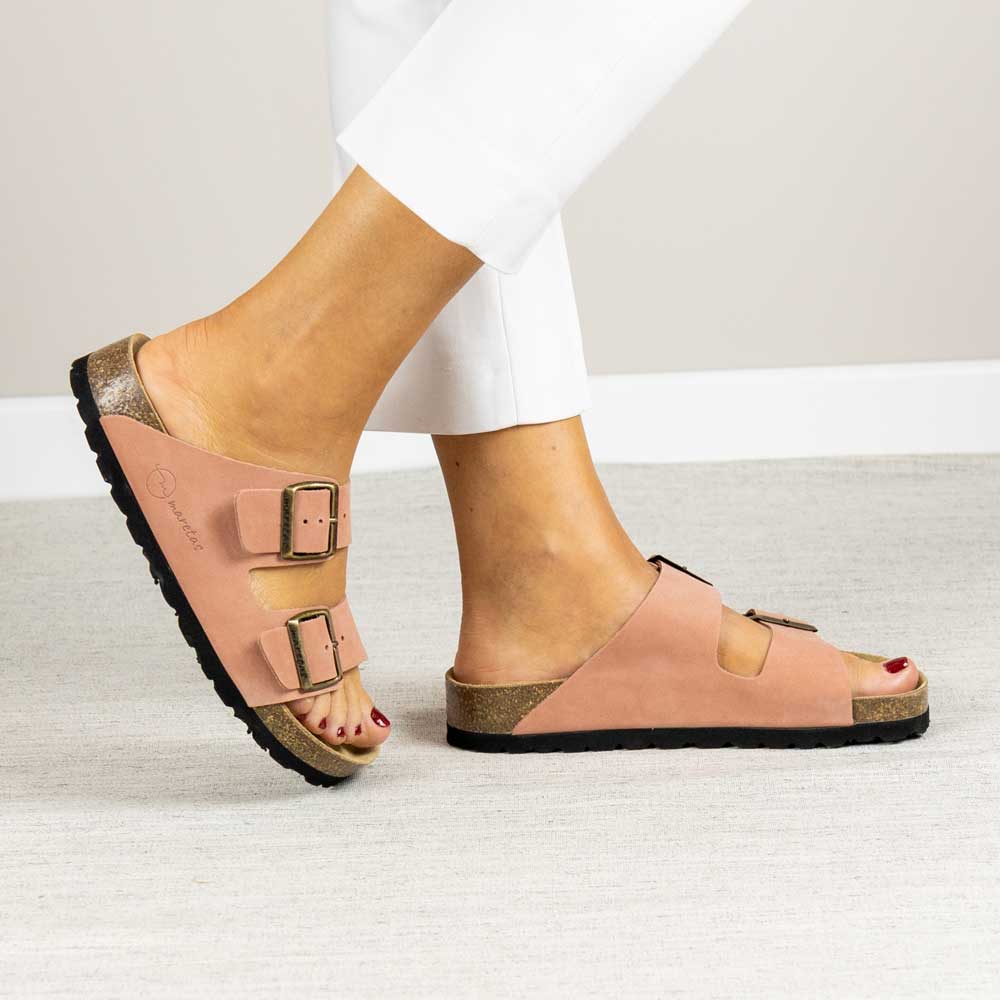 Suela de EVA antideslizante, flexible, junto con el Corcho amortiguan los pasos y protegen las articulaciones
