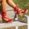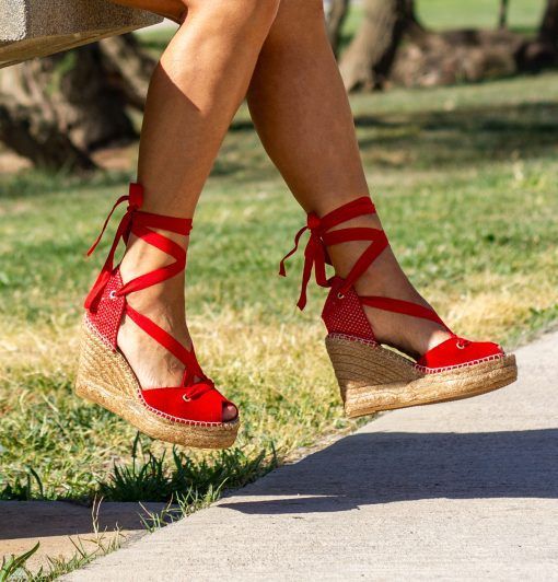 Alpargata con cuña elaborada en serraje. Talonera de tejido trenzado, y forrado para mayor resistencia y mayor comodidad ya que evita las arrugas en el talón. Cierre con cintas desde el empeine para atar al tobillo. Suela vulcanizada de yute teñido y caucho, forrada con piel y plantilla de látex, ofreciendo mayor confort al caminar. Altura de 10 cm, cuña de 7 cm y plataforma de 3 cm. Hechas totalmente a mano en España.