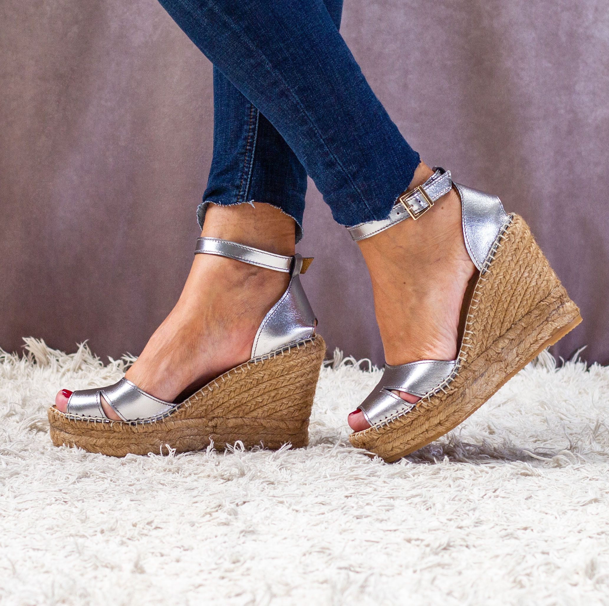Alpargata con cuña elaborada en piel. Talonera forrada para mayor resistencia y mayor comodidad ya que evita las arrugas en el talón. Cierre con pulsera al tobillo ajustable y hebilla, facilitando la sujeción al pie. Suela vulcanizada de yute teñido y caucho, forrada con piel y plantilla de látex, ofreciendo mayor confort al caminar. Altura de 10 cm, cuña de 7 cm y plataforma de 3 cm. Hechas totalmente a mano en España.