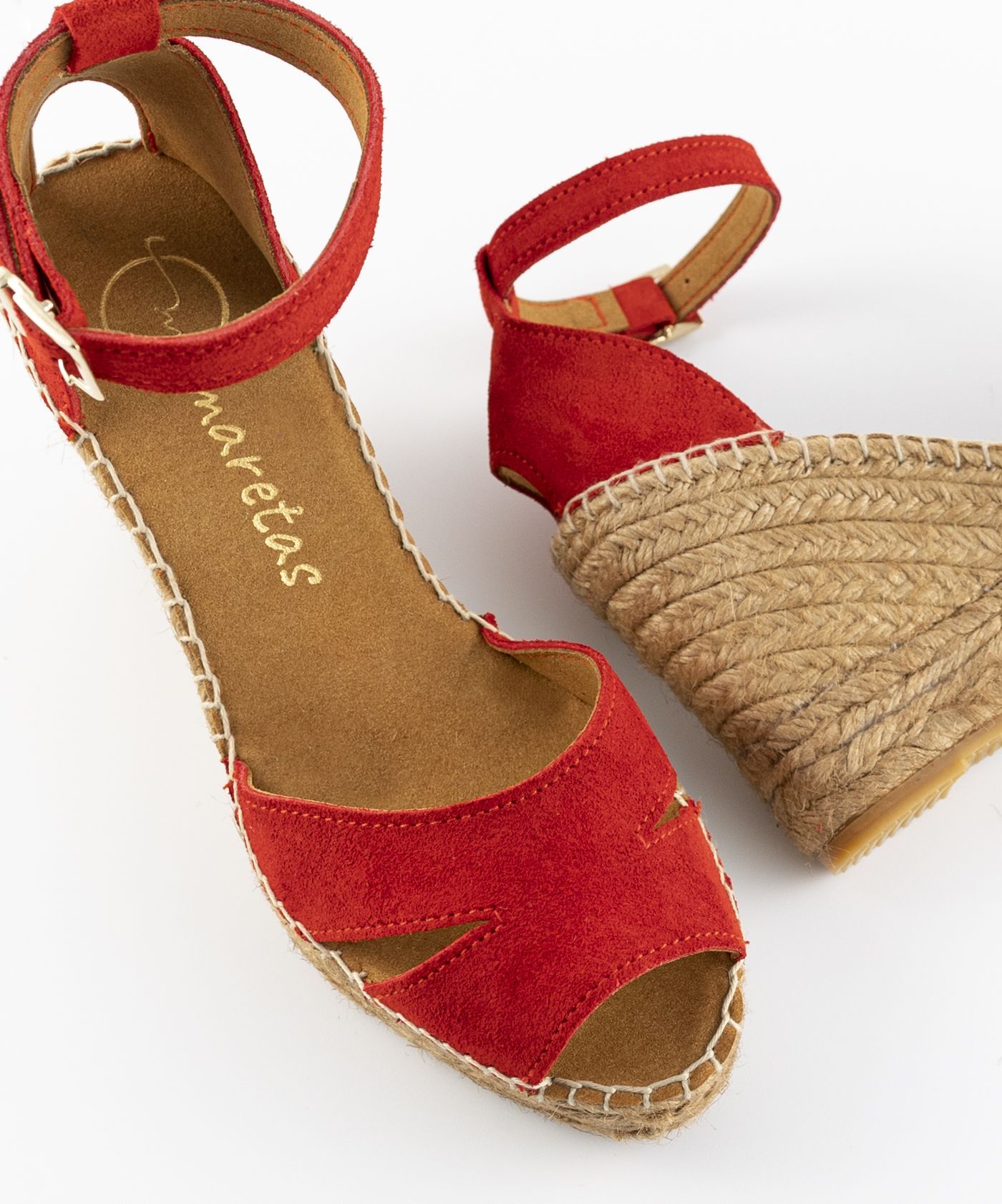 Alpargata con cuña elaborada en serraje. Talonera forrada para mayor resistencia y mayor comodidad ya que evita las arrugas en el talón. Cierre con pulsera al tobillo ajustable y hebilla, facilitando la sujeción al pie. Suela vulcanizada de yute teñido y caucho, forrada con piel y plantilla de látex, ofreciendo mayor confort al caminar. Altura de 10 cm, cuña de 7 cm y plataforma de 3 cm. Hechas totalmente a mano en España.