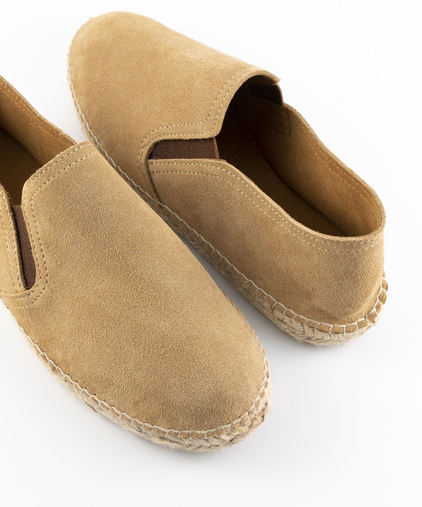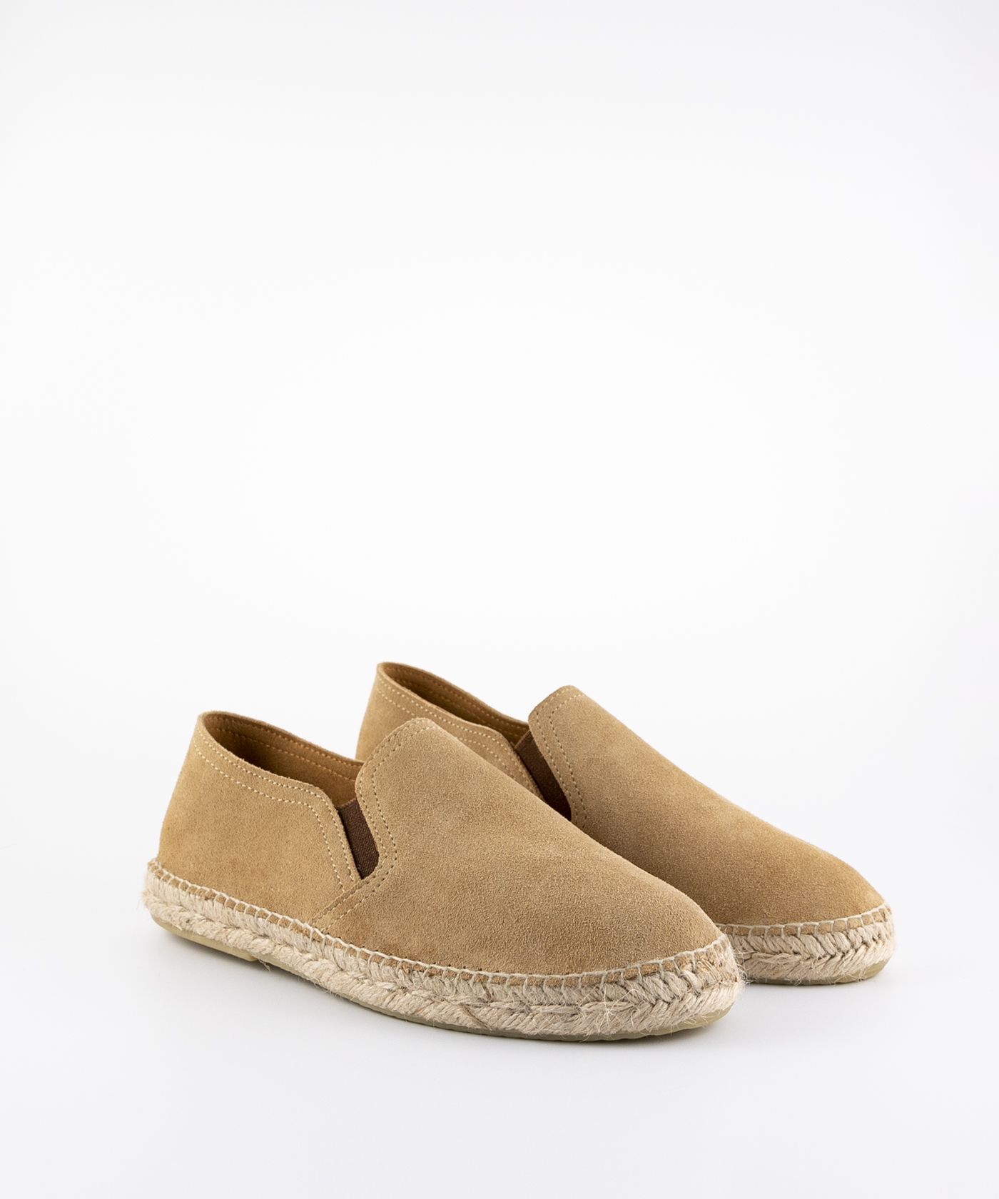 Alpargata plana de hombre confeccionada en serraje, con elásticos laterales, adaptándose a todos los pies. Suela vulcanizada de yute natural y caucho, forrada con piel y plantilla de látex ofreciendo mayor confort al caminar. Altura de suela de 2 cm. Hechas totalmente a mano en España.