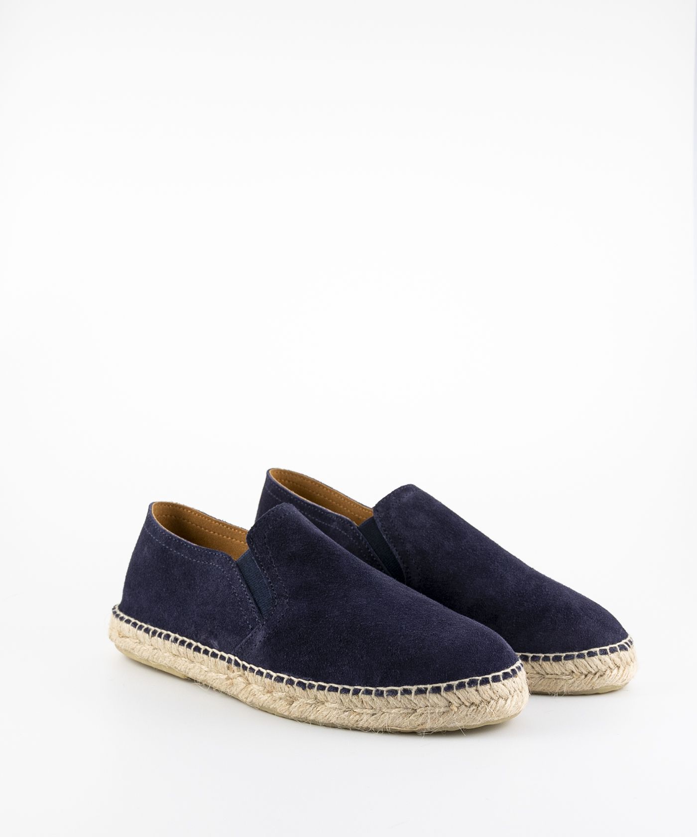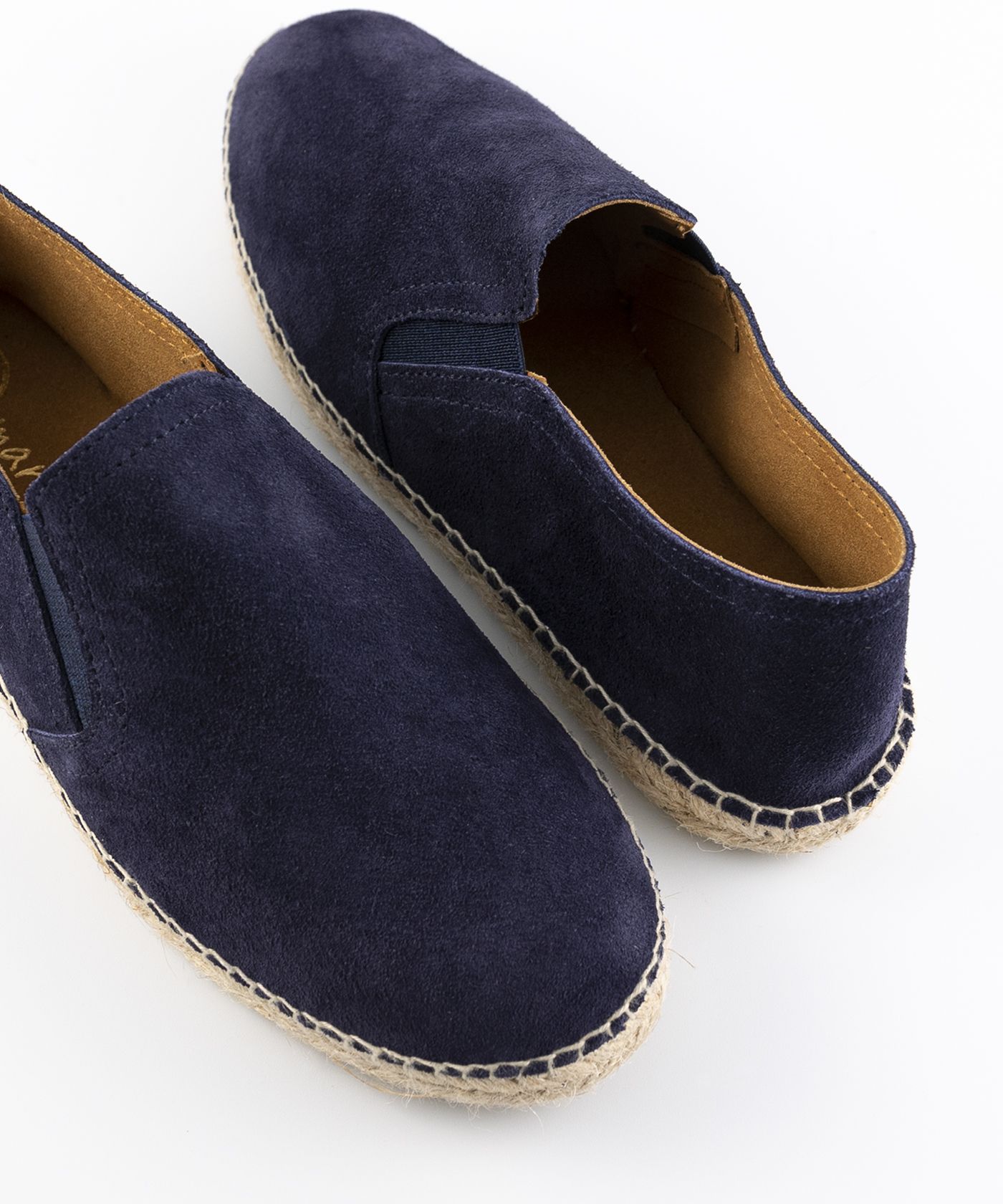 Alpargata plana de hombre confeccionada en serraje, con elásticos laterales, adaptándose a todos los pies. Suela vulcanizada de yute natural y caucho, forrada con piel y plantilla de látex ofreciendo mayor confort al caminar. Altura de suela de 2 cm. Hechas totalmente a mano en España.