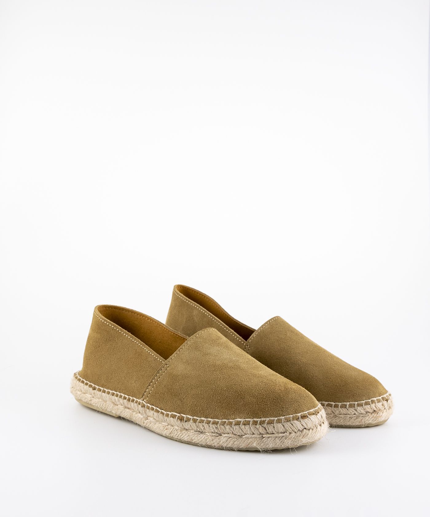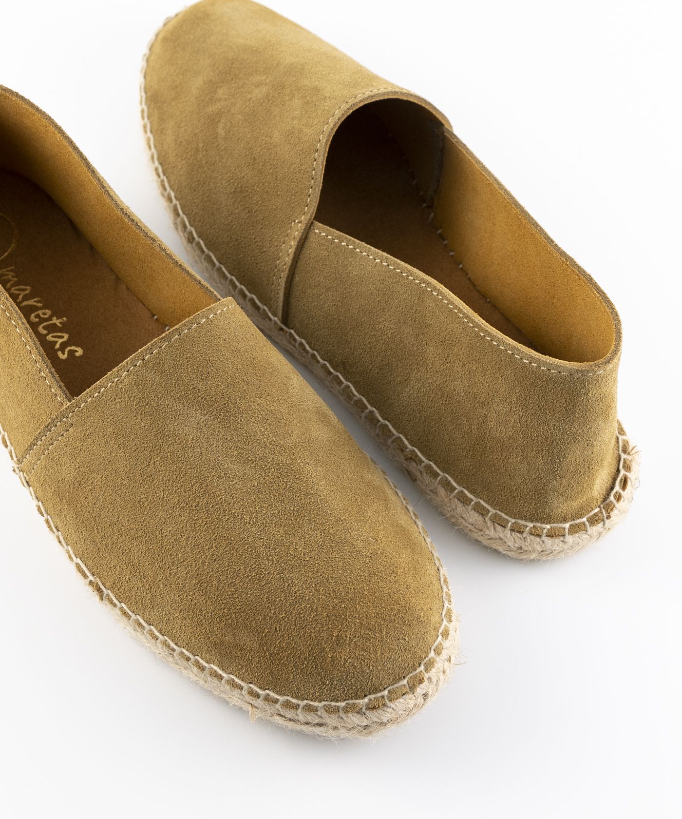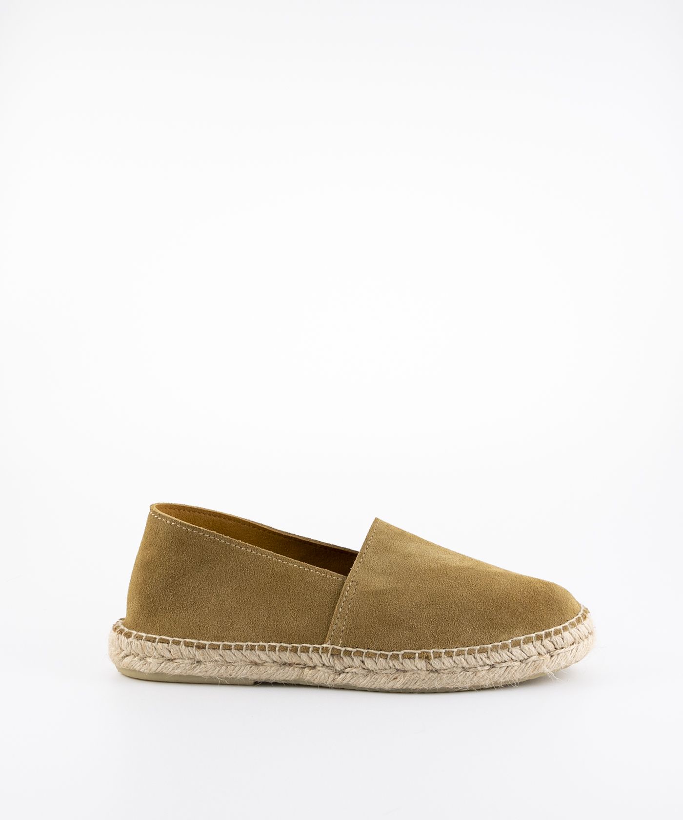 Alpargata plana tipo camping, elaborada en serraje. Suela vulcanizada de yute natural y caucho, forrada con piel y plantilla de látex ofreciendo mayor confort al caminar. Altura de suela de 2 cm. Hechas totalmente a mano en España.