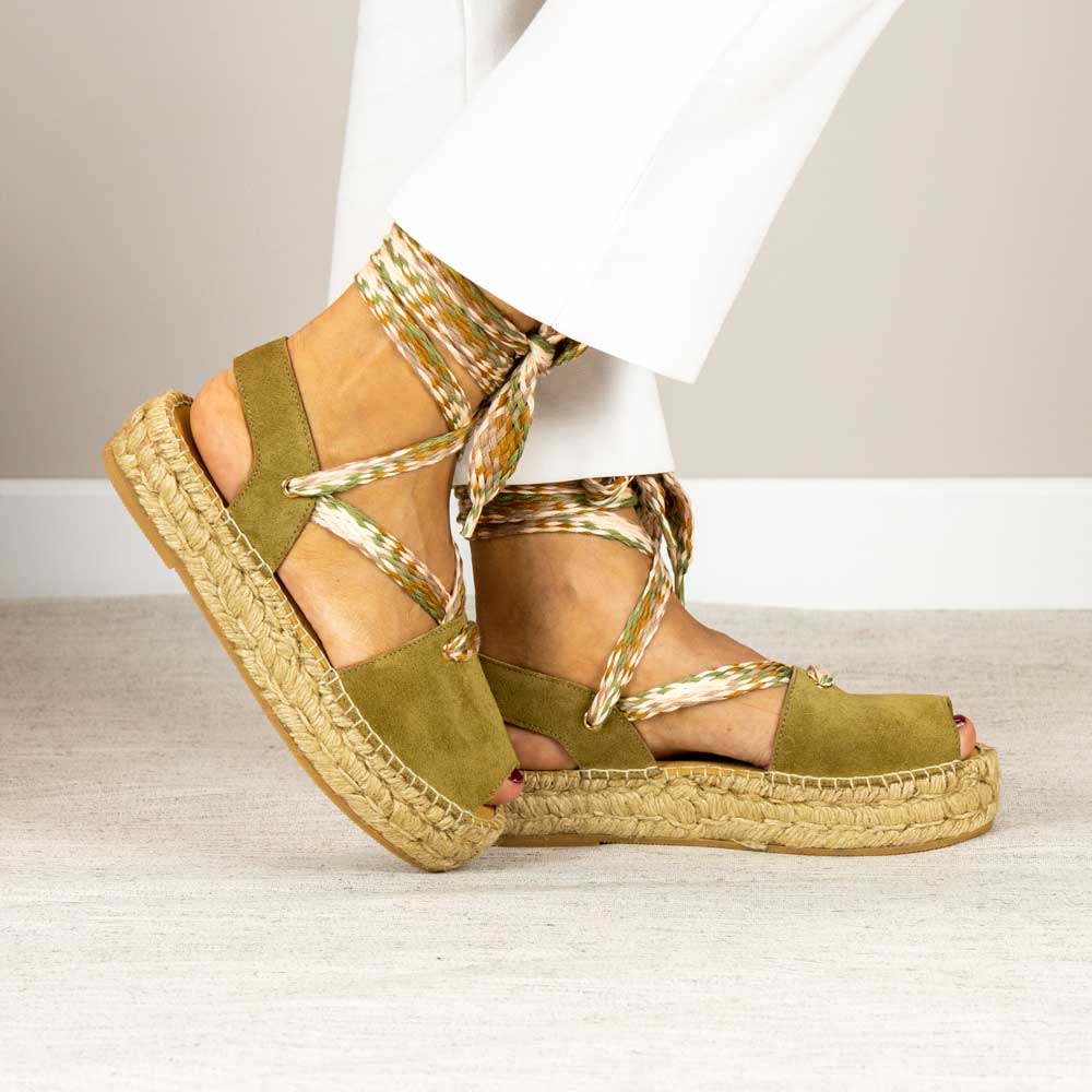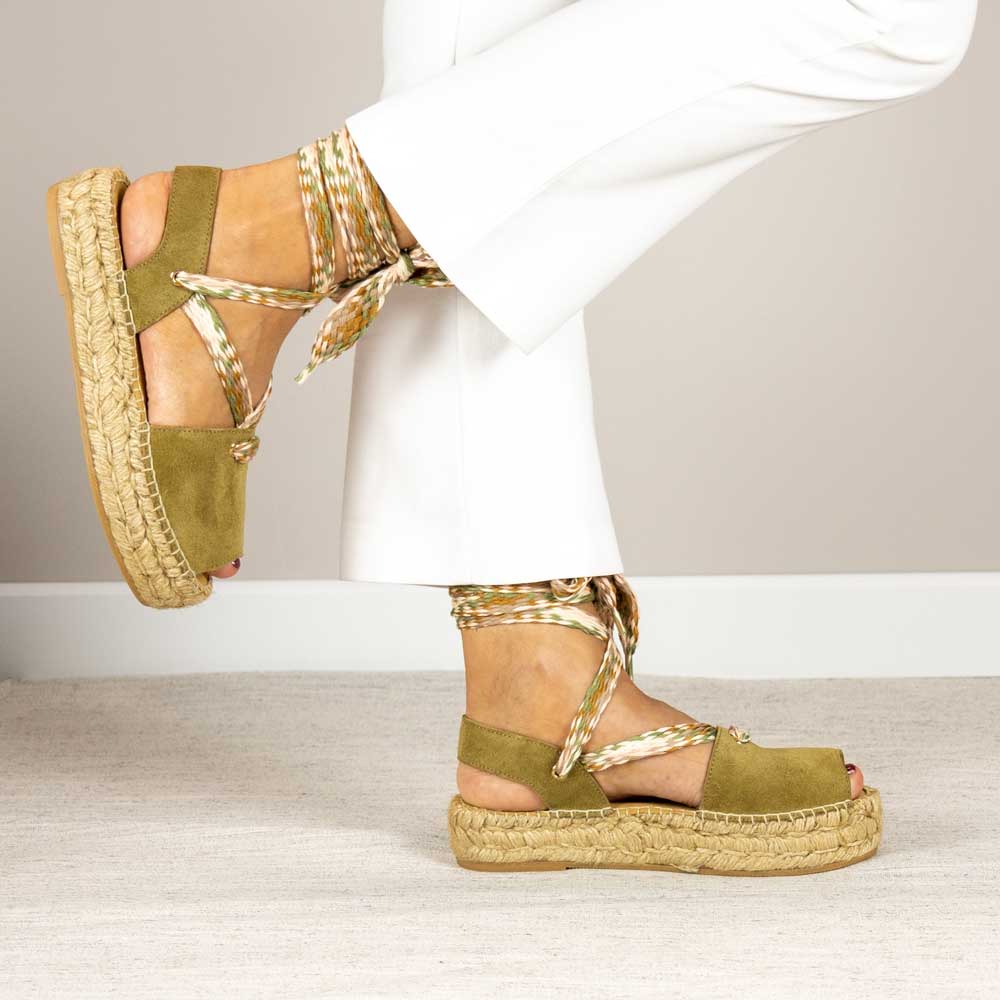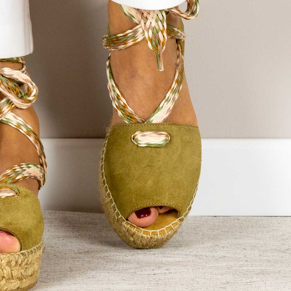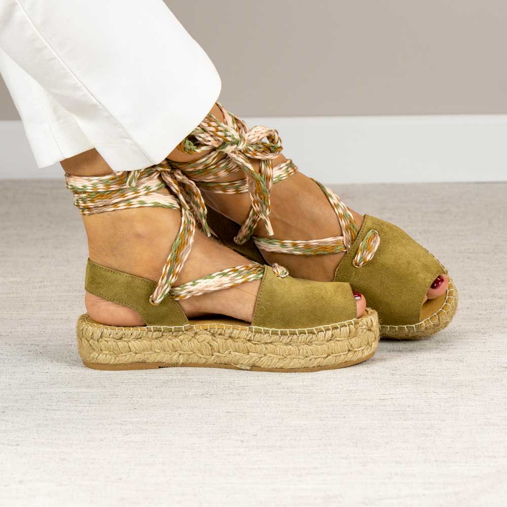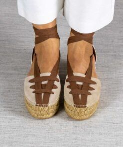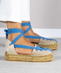 Alpargata con plataforma elaborada en serraje. Talón de serraje . Suela vulcanizada de yute teñido y caucho, forrada con microfibra y plantilla de látex, ofreciendo mayor confort al caminar. Plataforma de 3.5 cm. Hechas totalmente a mano en España.