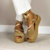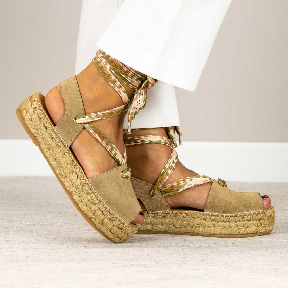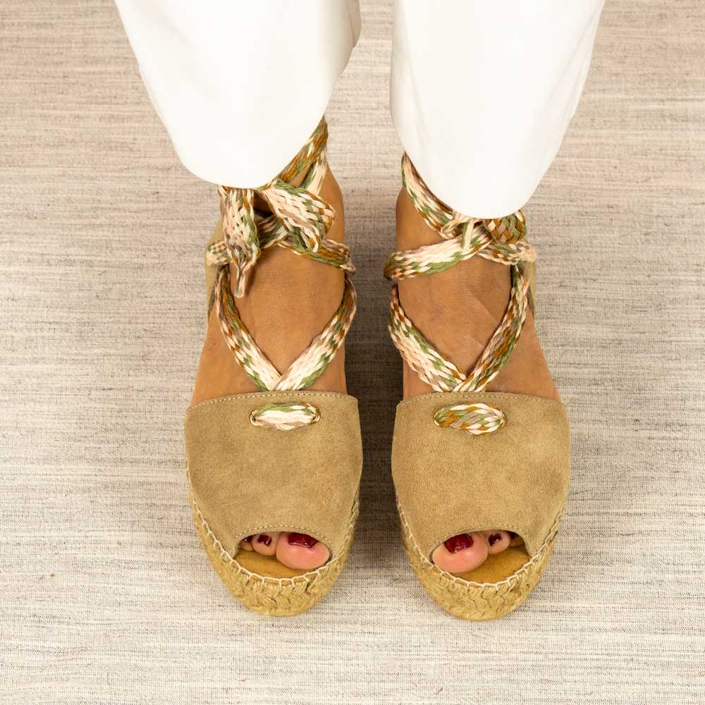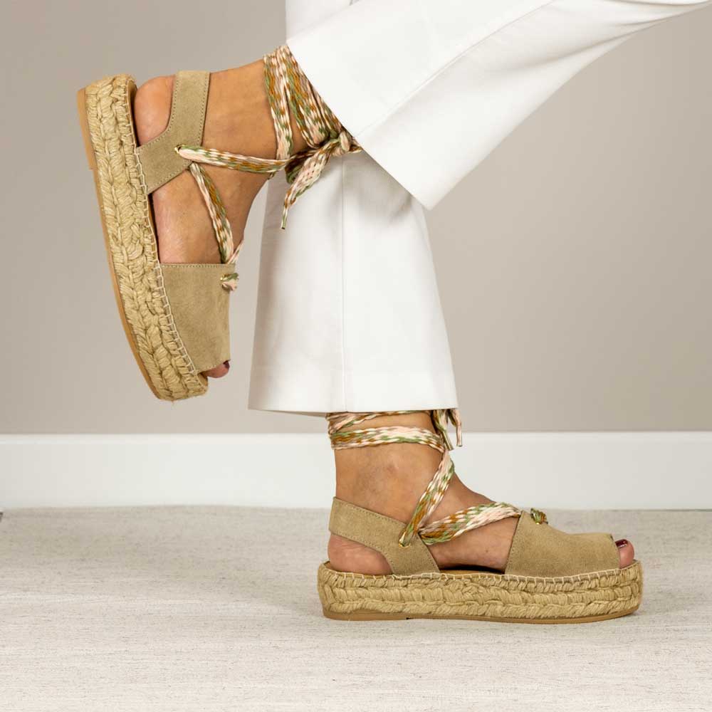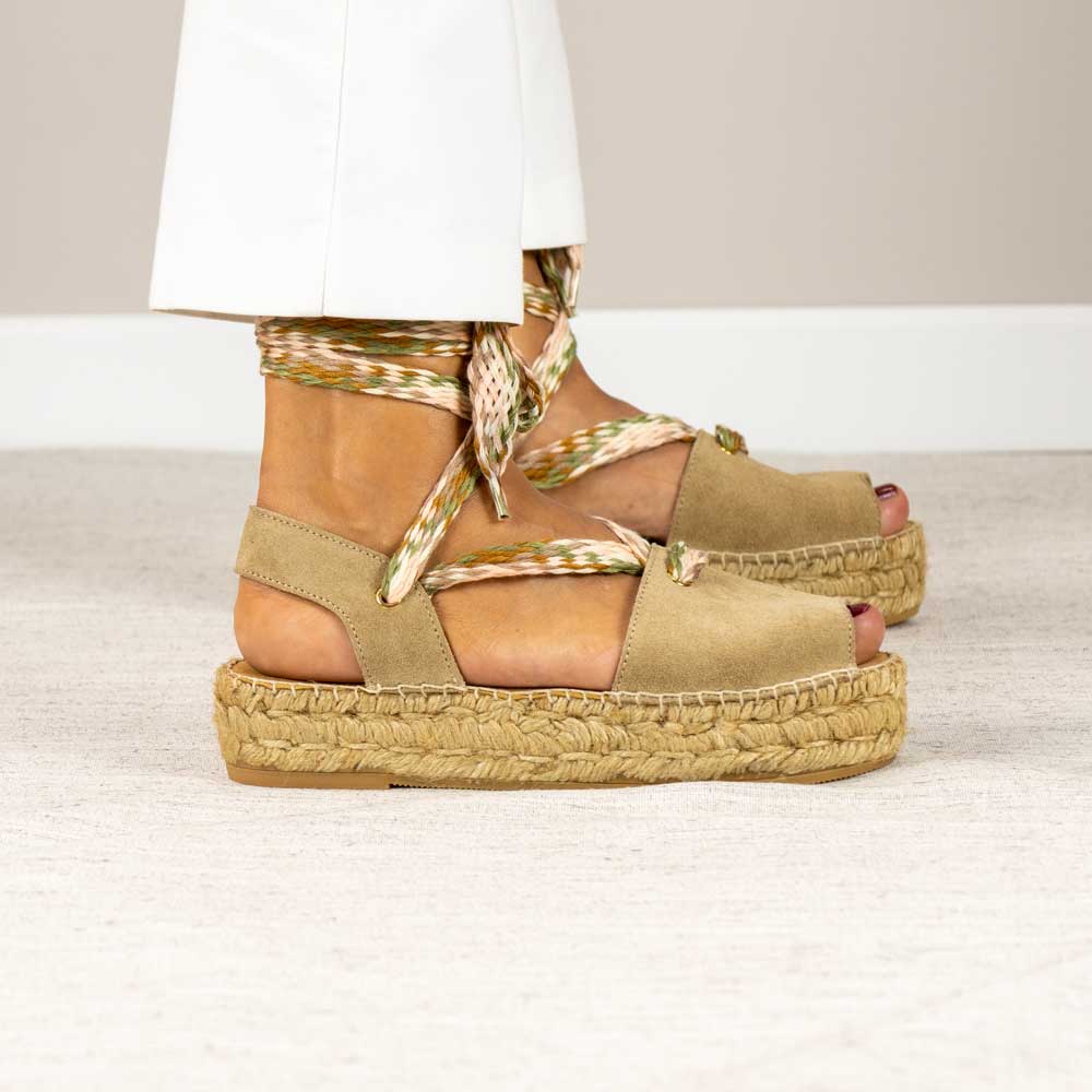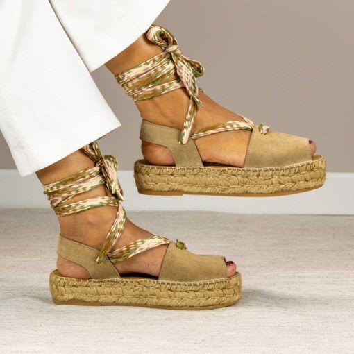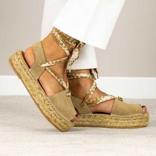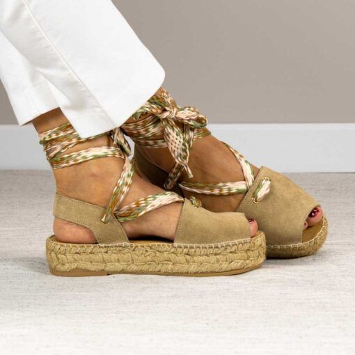 Alpargata con plataforma elaborada en serraje. Talón de serraje . Suela vulcanizada de yute teñido y caucho, forrada con microfibra y plantilla de látex, ofreciendo mayor confort al caminar. Plataforma de 3.5 cm. Hechas totalmente a mano en España.