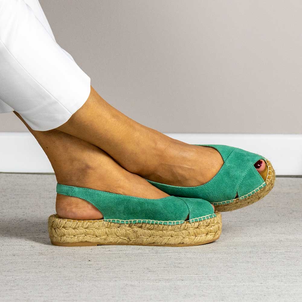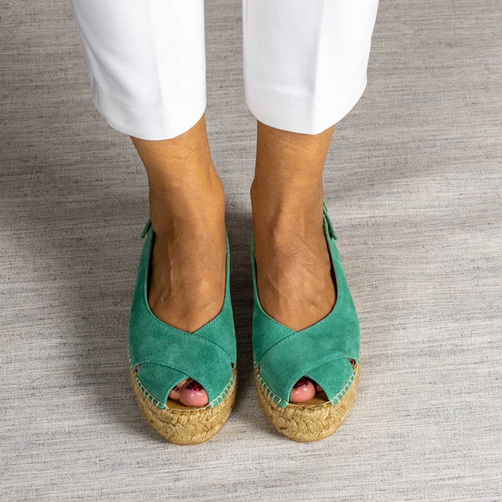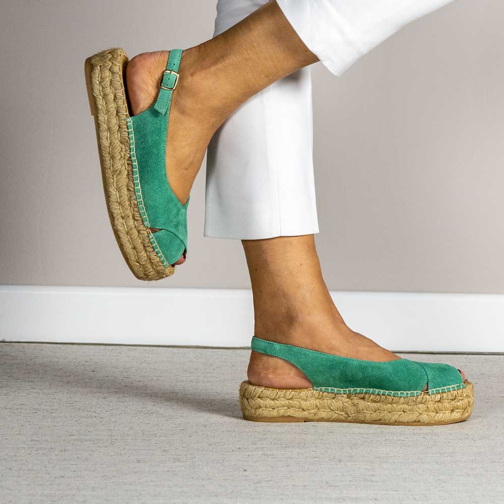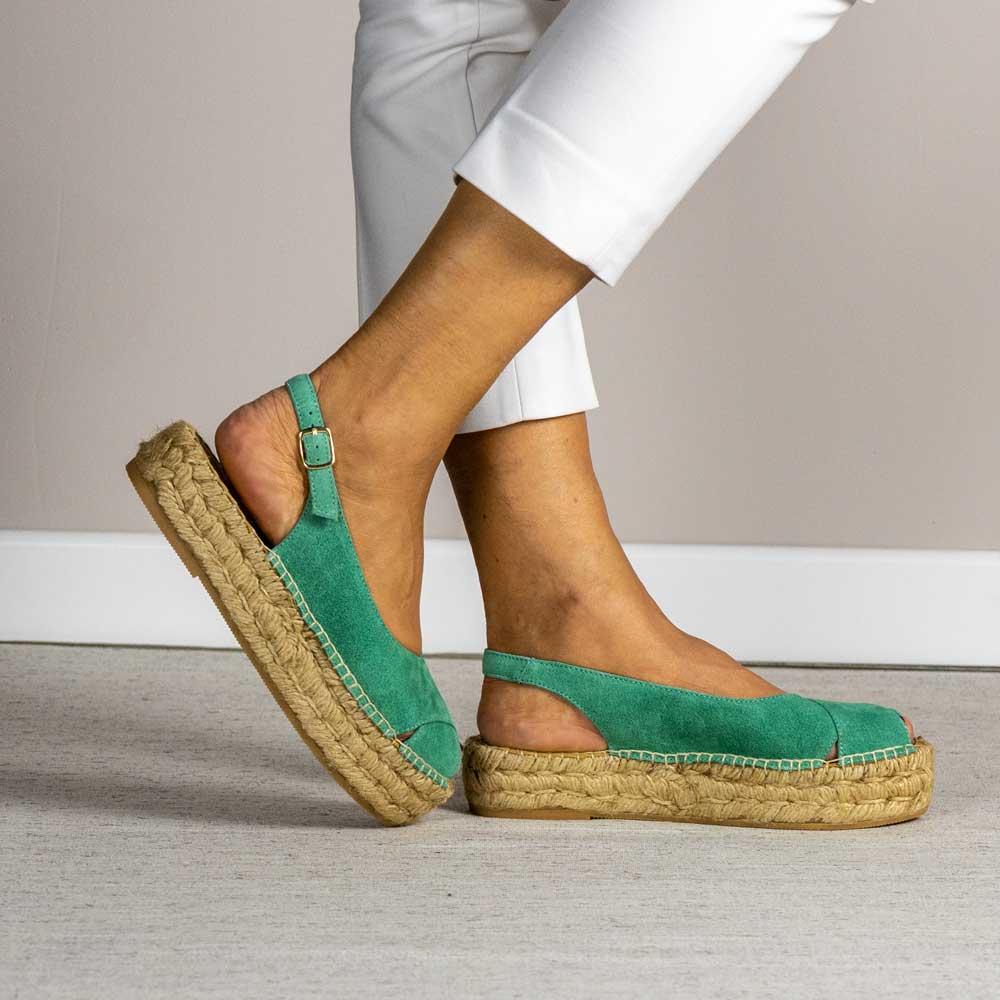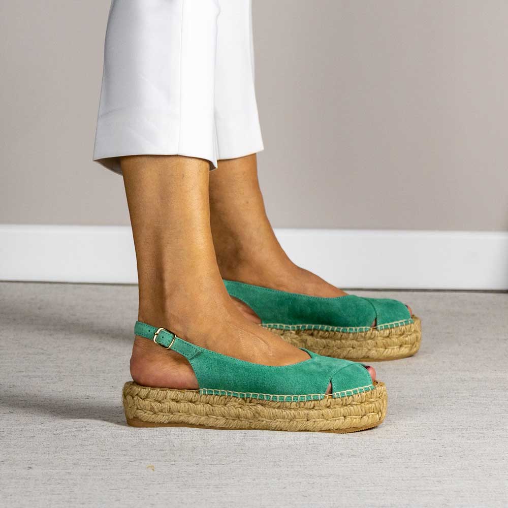 Alpargata con plataforma elaborada en serraje. Talón de piel . Suela vulcanizada de yute teñido y caucho, forrada con microfibra y plantilla de látex, ofreciendo mayor confort al caminar. Plataforma de 3.5 cm. Hechas totalmente a mano en España.