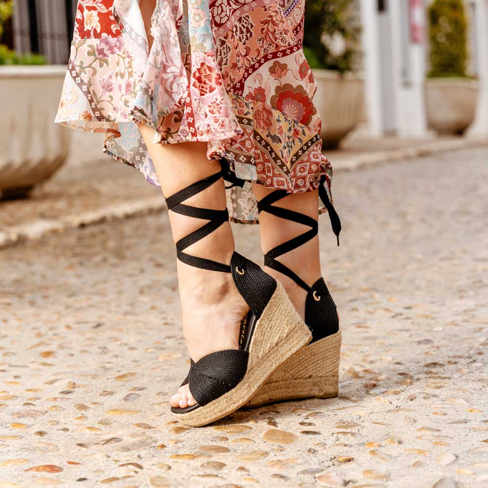 Alpargata con cuña elaborada tejido. Talonera de tejido trenzado, y forrado para mayor resistencia y mayor comodidad ya que evita las arrugas en el talón. Cierre con cintas desde el empeine para atar al tobillo. Suela vulcanizada de yute teñido y caucho, forrada con piel y plantilla de látex, ofreciendo mayor confort al caminar. Altura de 10 cm, cuña de 7 cm y plataforma de 3 cm. Hechas totalmente a mano en España.