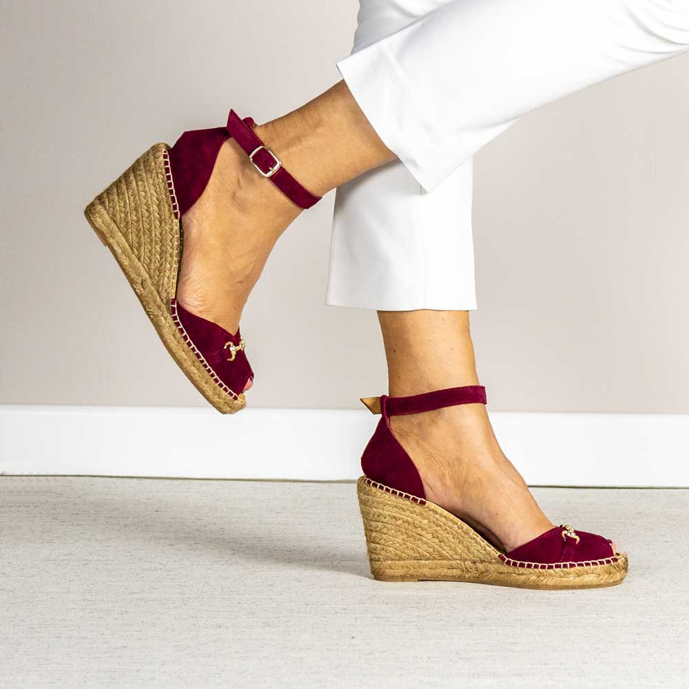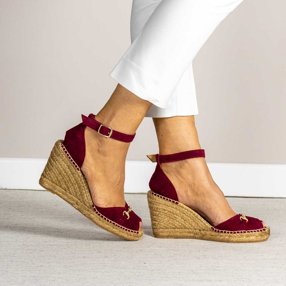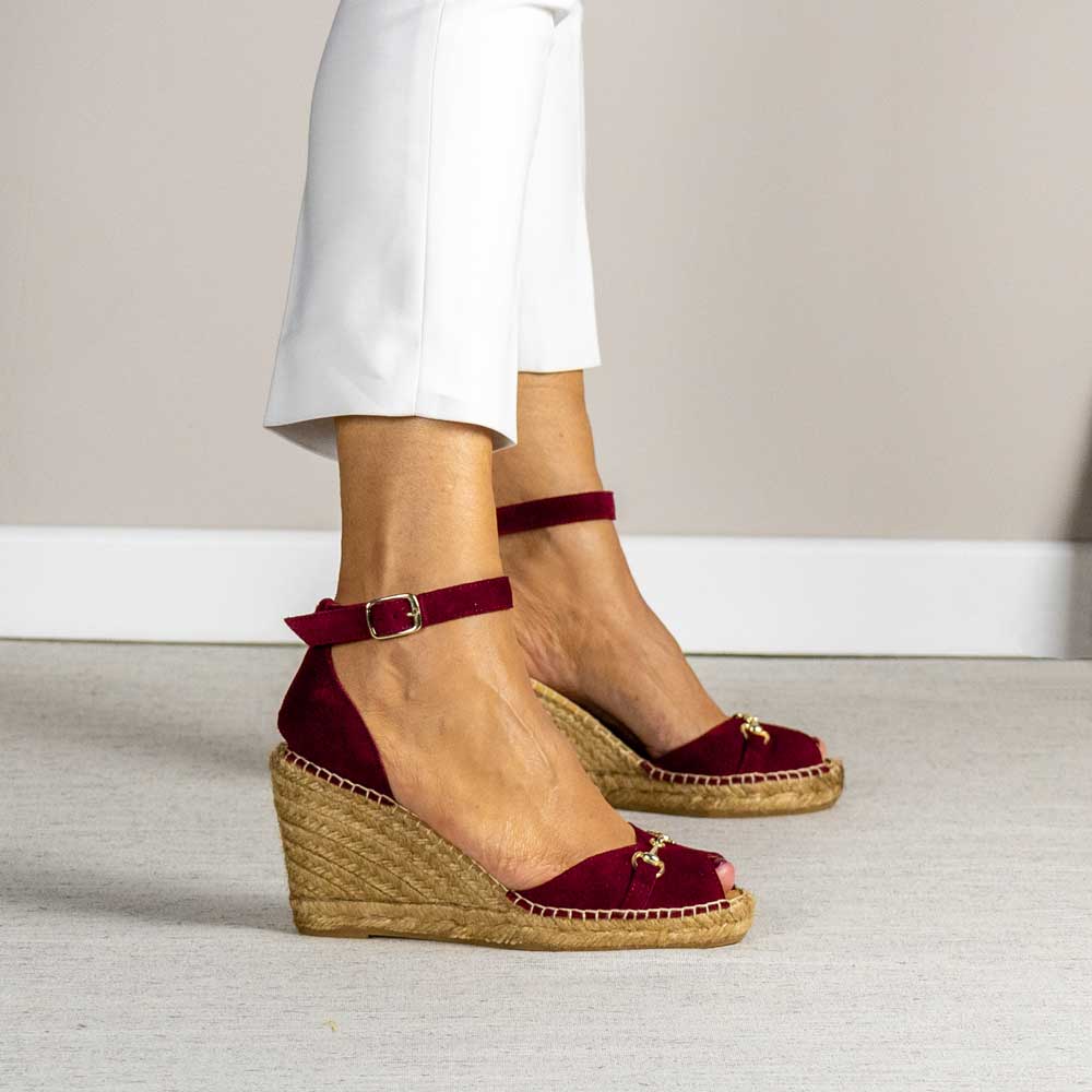 Cuña elaborada en serraje. Talón serraje.Suela vulcanizada de yute teñido y caucho, forrada con microfibra y plantilla de látex, ofreciendo mayor confort al caminar. Altura de 9 cm, cuña de 7 cm y plataforma de 2 cm. Hechas totalmente a mano en España.