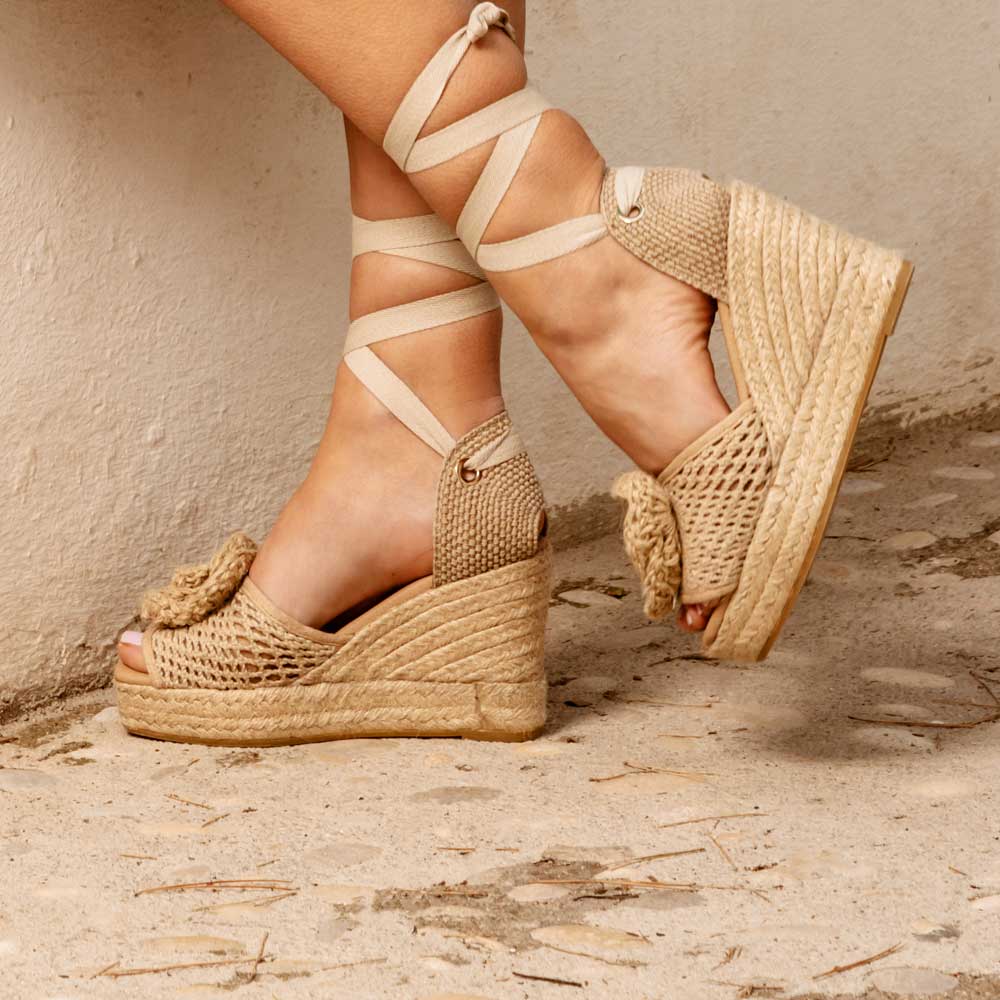 Alpargata con cuña elaborada tejido.Flor de croché elaborada a mano.Talonera de tejido trenzado, y forrado para mayor resistencia y mayor comodidad ya que evita las arrugas en el talón. Cierre con cintas para atar al tobillo. Suela vulcanizada de yute teñido y caucho, forrada con piel y plantilla de látex, ofreciendo mayor confort al caminar. Altura de 10 cm, cuña de 7 cm y plataforma de 3 cm. Hechas totalmente a mano en España.