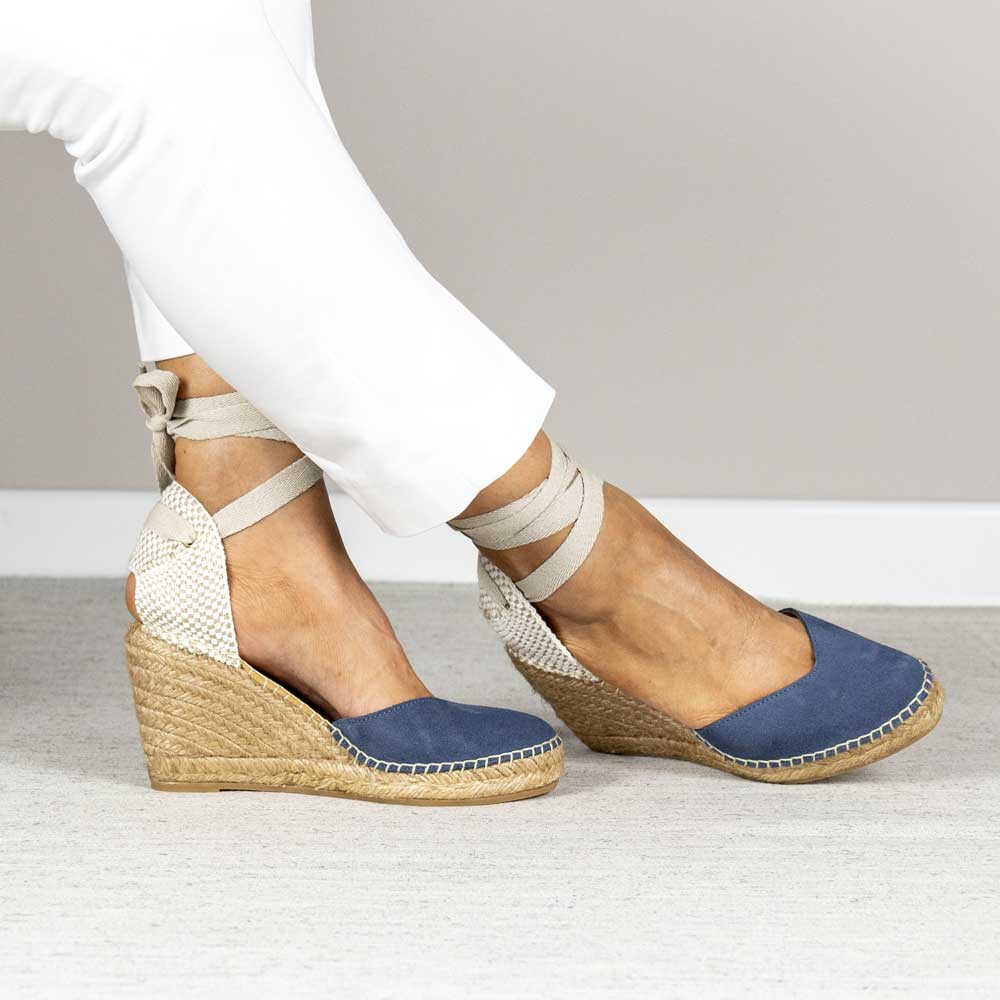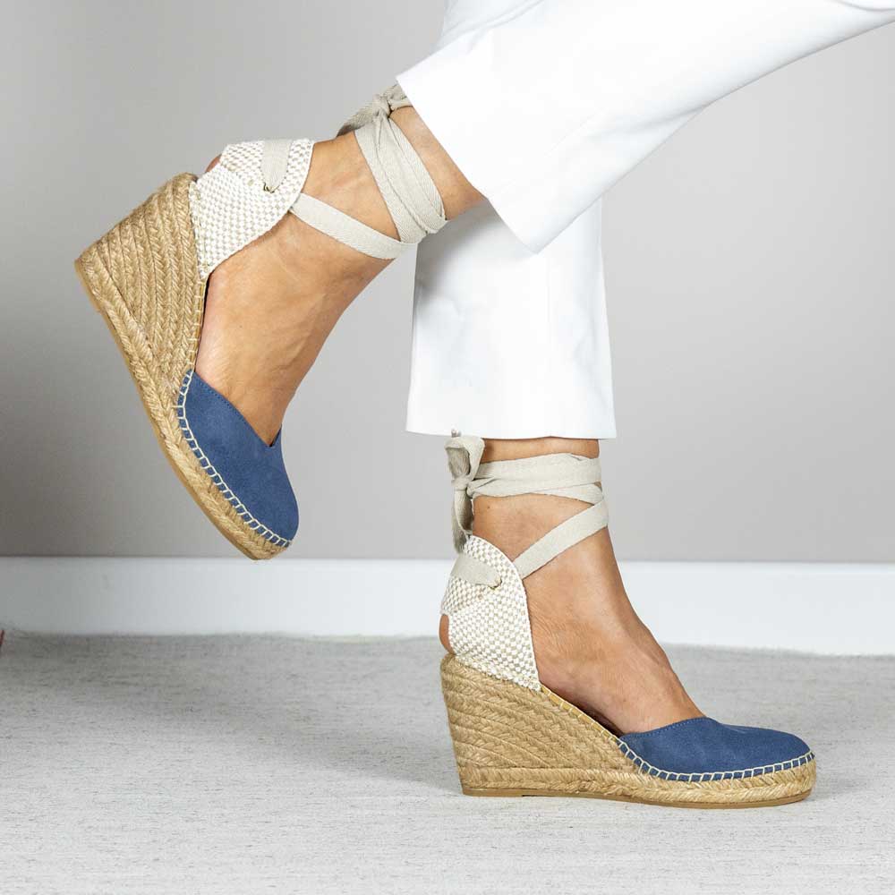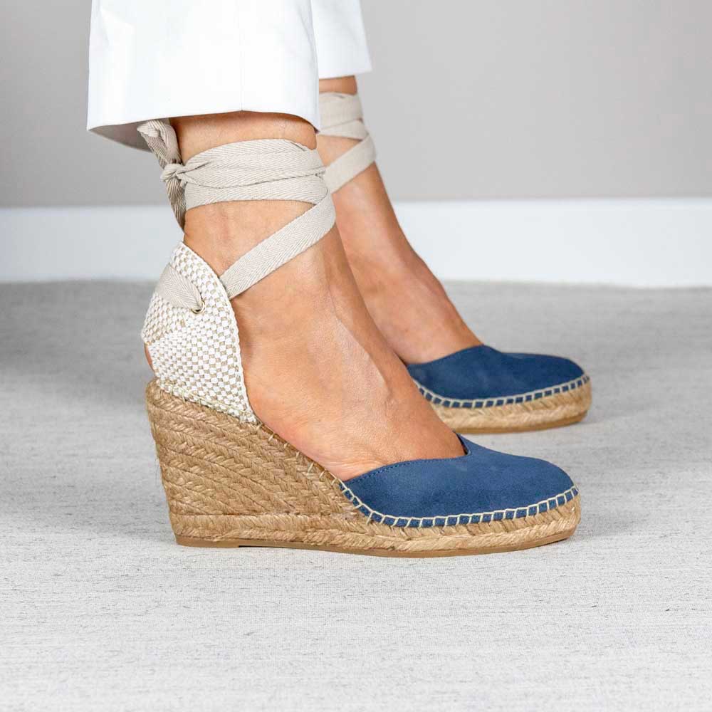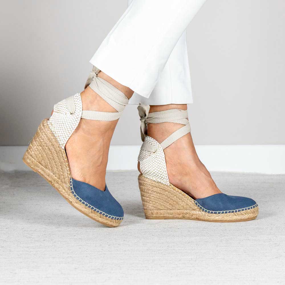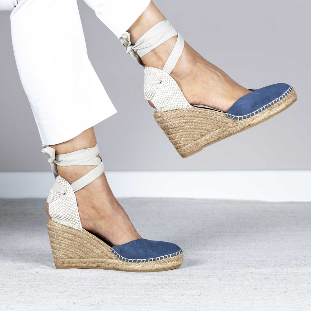 Alpargata con cuña elaborada en serraje. Cierre con cintas . Suela vulcanizada de yute teñido y caucho, forrada con microfibra y plantilla de látex, ofreciendo mayor confort al caminar. Altura de 9 cm, cuña de 7 cm y plataforma de 2 cm. Hechas totalmente a mano en España.