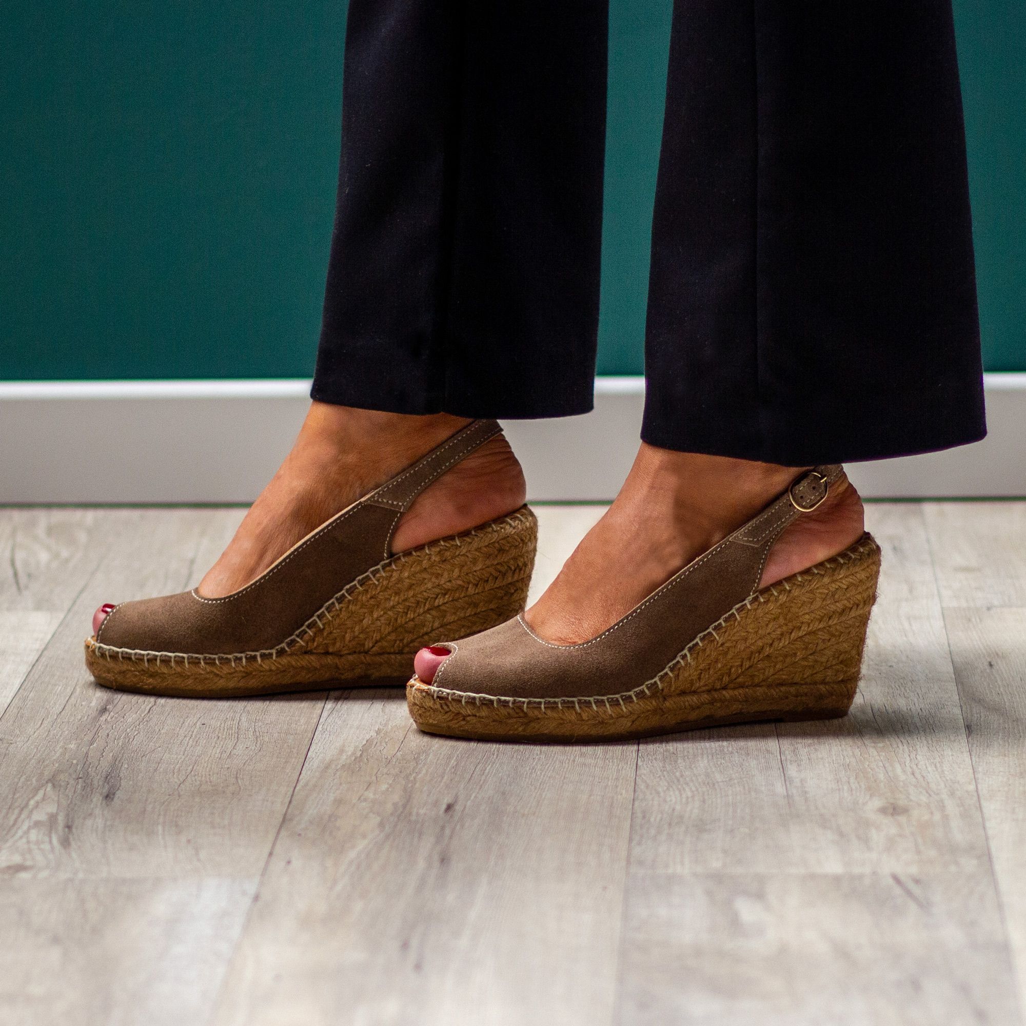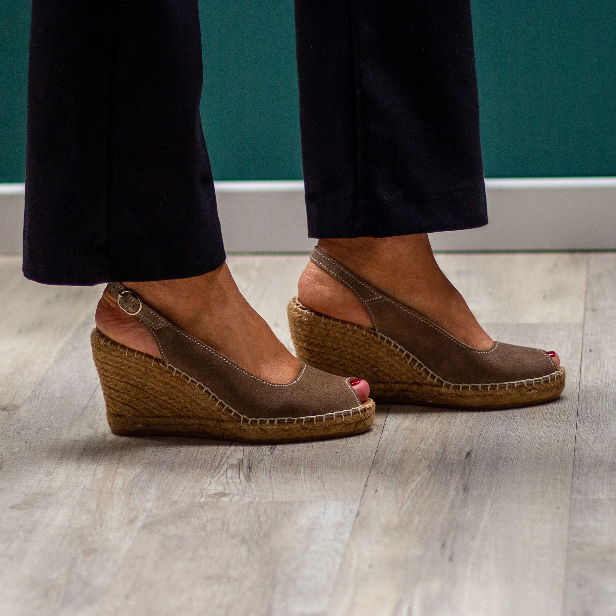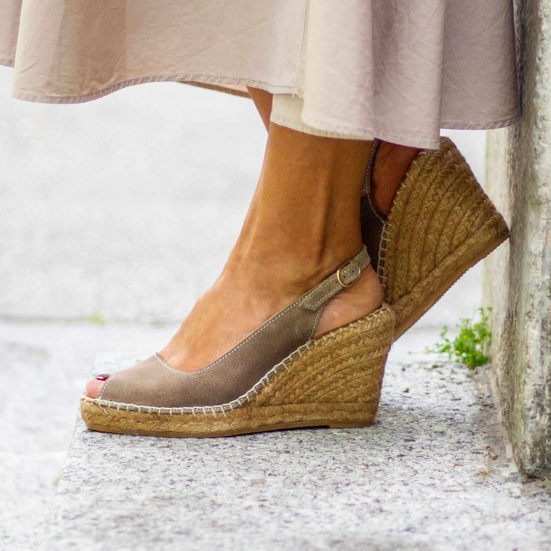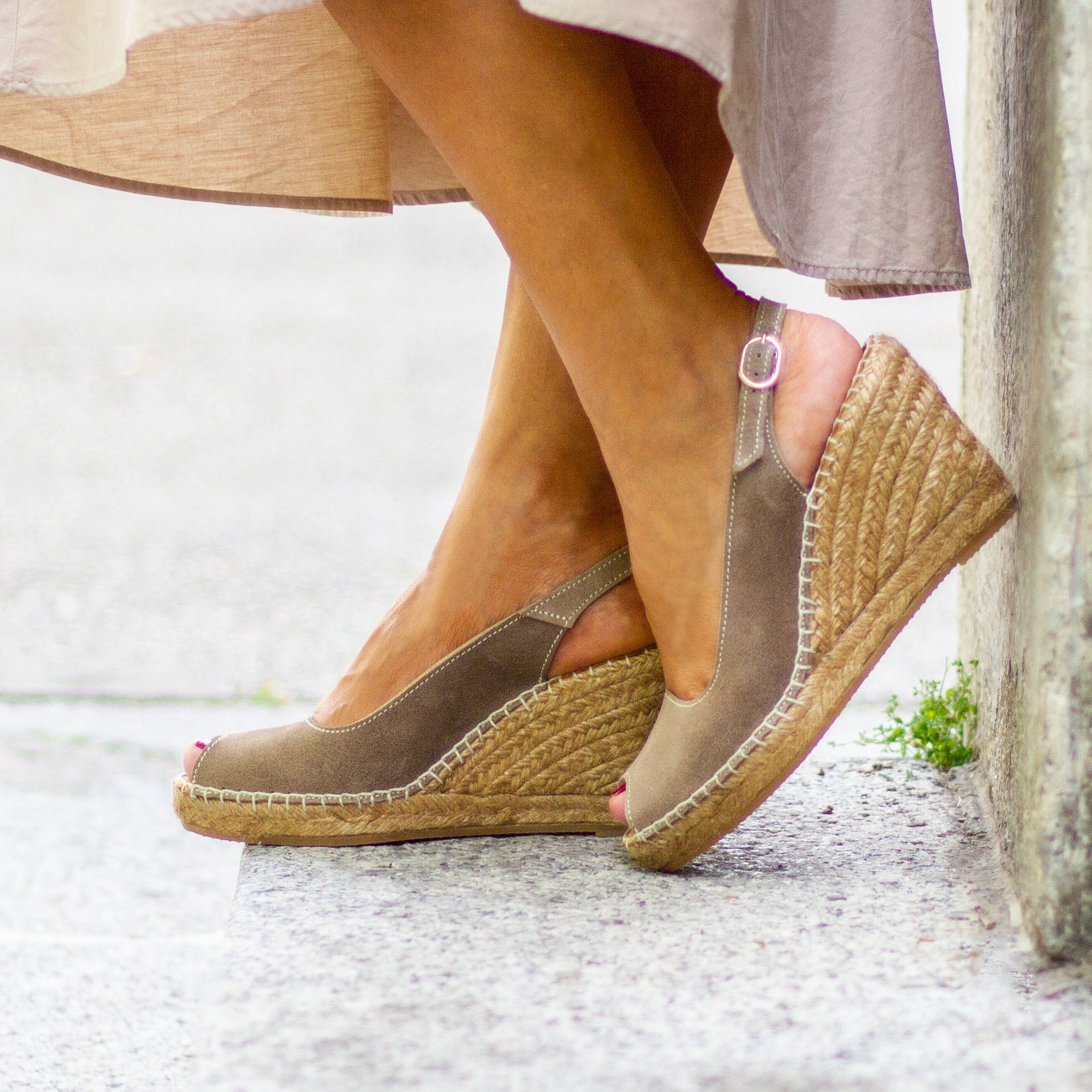 Alpargata con cuña elaborada en serraje. Suela vulcanizada de yute teñido y caucho, forrada con microfibra y plantilla de látex, ofreciendo mayor confort al caminar. Altura de 9 cm, cuña de 7 cm y plataforma de 2 cm. Hechas totalmente a mano en España.