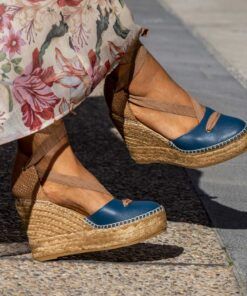 Alpargata con cuña elaborada tejido.Talonera de tejido trenzado, y forrado para mayor resistencia y mayor comodidad ya que evita las arrugas en el talón. Cierre con cintas para atar al tobillo. Suela vulcanizada de yute teñido y caucho, forrada con piel y plantilla de látex, ofreciendo mayor confort al caminar. Altura de 10 cm, cuña de 7 cm y plataforma de 3 cm. Hechas totalmente a mano en España.