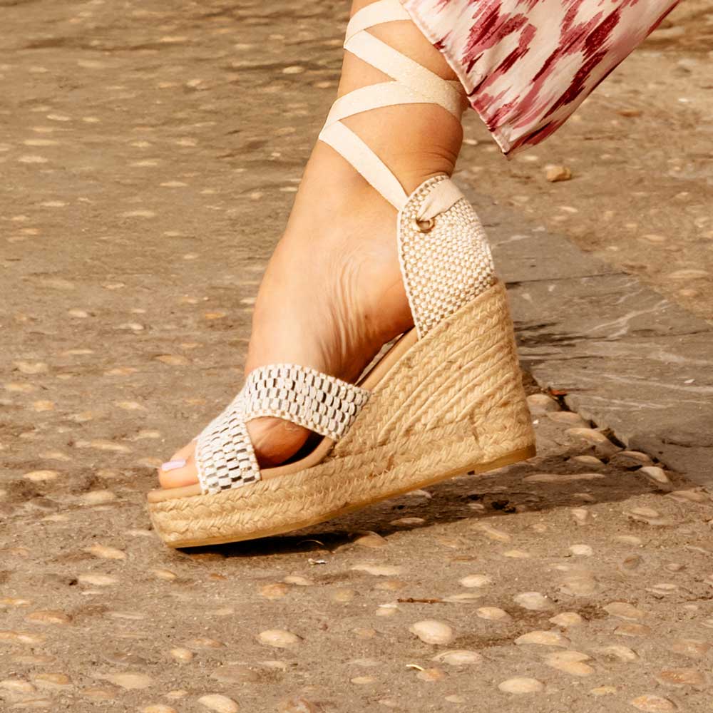 Alpargata con cuña elaborada tejido.Talonera de tejido trenzado, y forrado para mayor resistencia y mayor comodidad ya que evita las arrugas en el talón. Cierre con cintas para atar al tobillo. Suela vulcanizada de yute teñido y caucho, forrada con piel y plantilla de látex, ofreciendo mayor confort al caminar. Altura de 10 cm, cuña de 7 cm y plataforma de 3 cm. Hechas totalmente a mano en España.