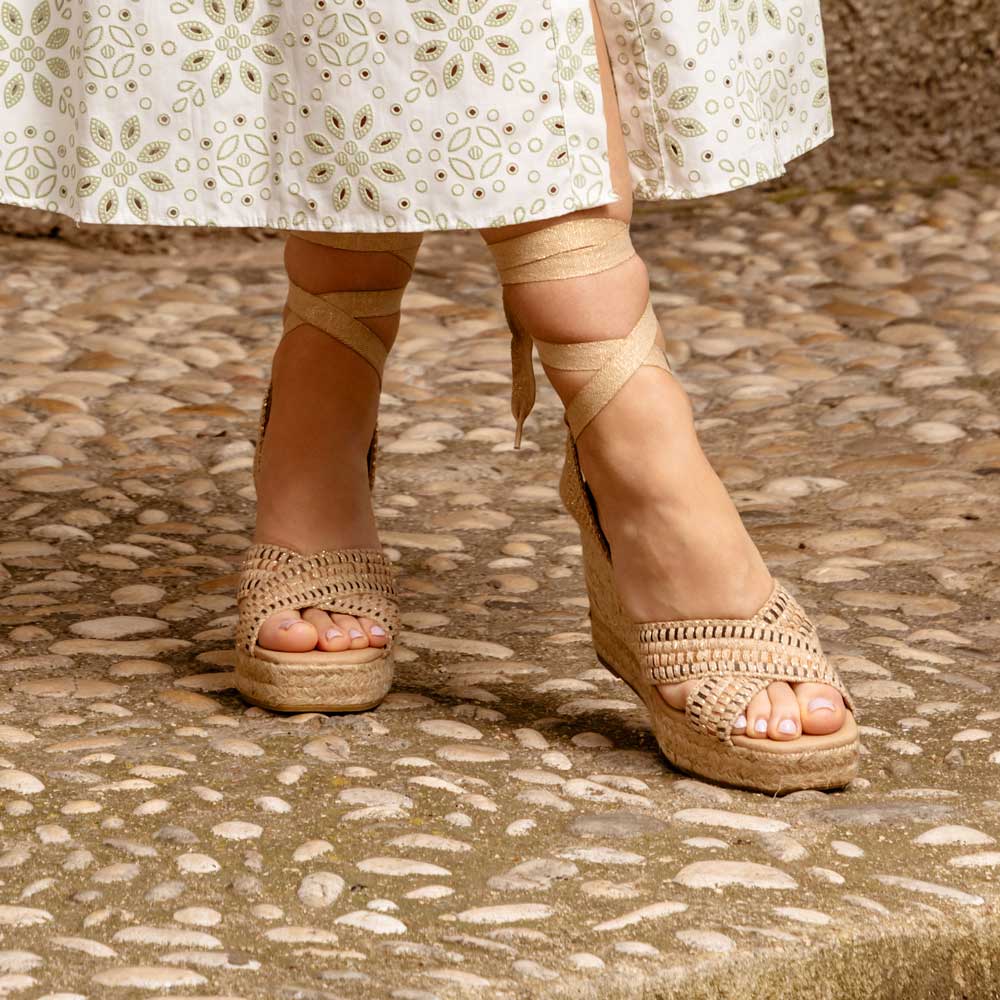 Alpargata con cuña elaborada tejido.Talonera de tejido trenzado, y forrado para mayor resistencia y mayor comodidad ya que evita las arrugas en el talón. Cierre con cintas para atar al tobillo. Suela vulcanizada de yute teñido y caucho, forrada con piel y plantilla de látex, ofreciendo mayor confort al caminar. Altura de 10 cm, cuña de 7 cm y plataforma de 3 cm. Hechas totalmente a mano en España.