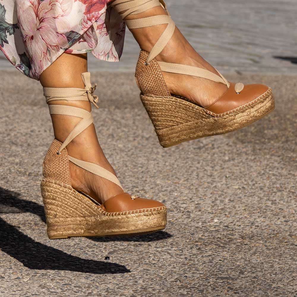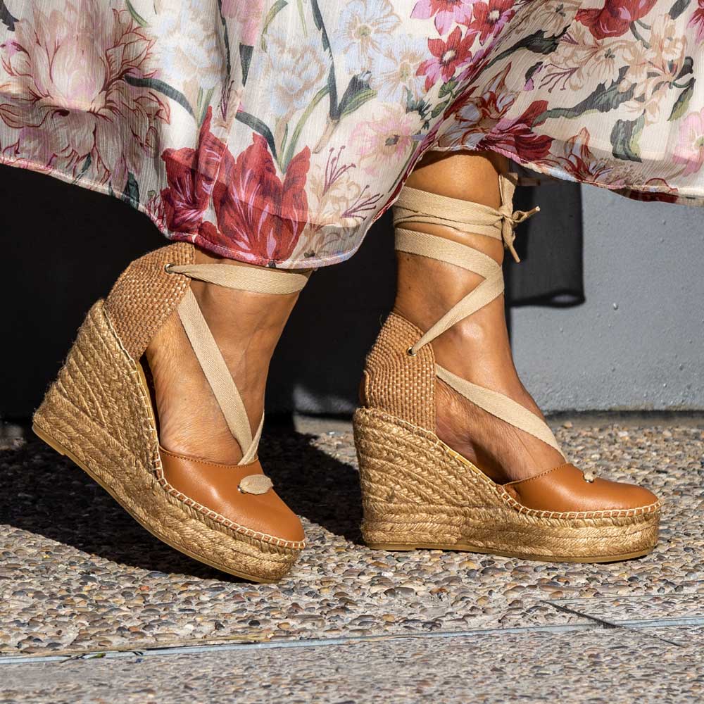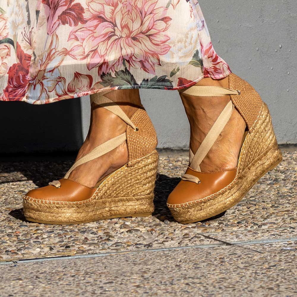 Alpargata con cuña elaborada en napa. Talonera de tejido trenzado, y forrado para mayor resistencia y mayor comodidad ya que evita las arrugas en el talón. Cierre con cintas desde el empeine para atar al tobillo. Suela vulcanizada de yute teñido y caucho, forrada con piel y plantilla de látex, ofreciendo mayor confort al caminar. Altura de 10 cm, cuña de 7 cm y plataforma de 3 cm. Hechas totalmente a mano en España.