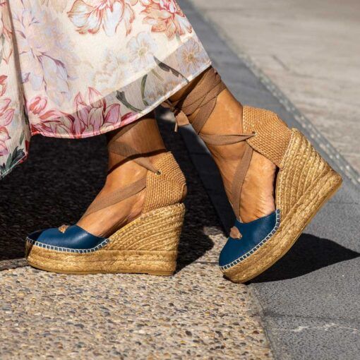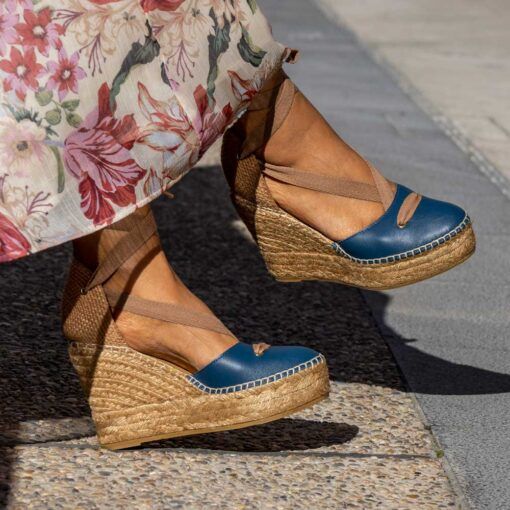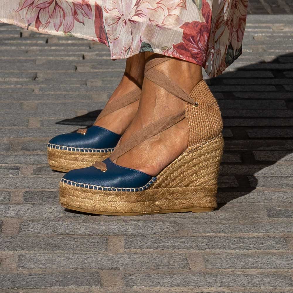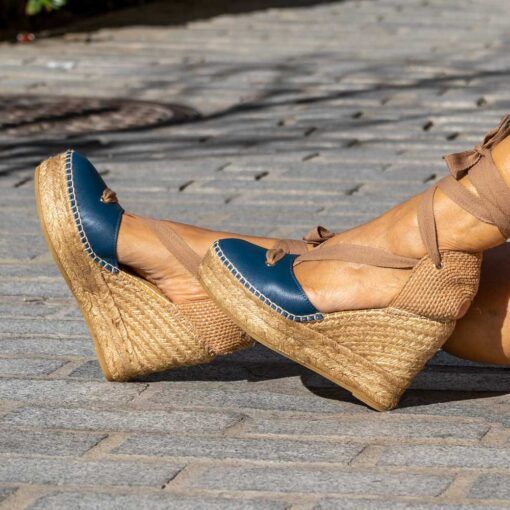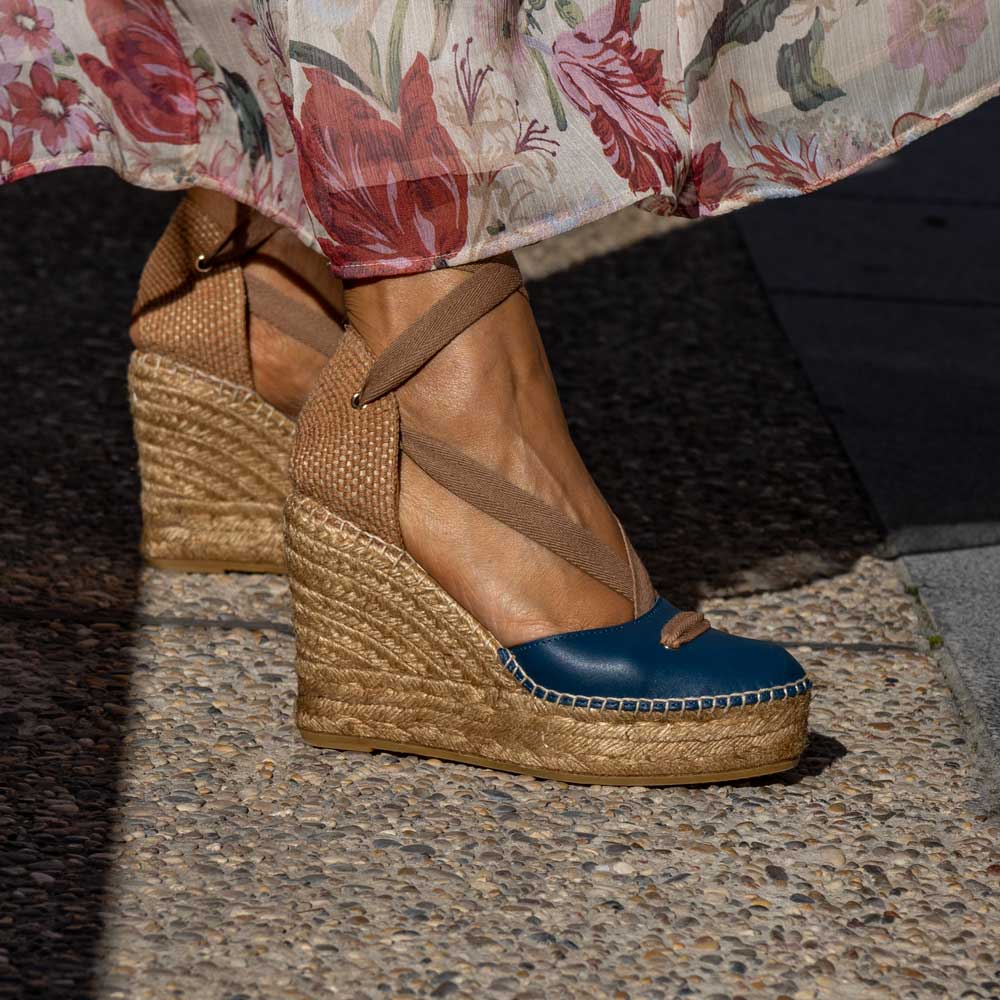 Alpargata con cuña elaborada en napa. Talonera de tejido trenzado, y forrado para mayor resistencia y mayor comodidad ya que evita las arrugas en el talón. Cierre con cintas desde el empeine para atar al tobillo. Suela vulcanizada de yute teñido y caucho, forrada con piel y plantilla de látex, ofreciendo mayor confort al caminar. Altura de 10 cm, cuña de 7 cm y plataforma de 3 cm. Hechas totalmente a mano en España.