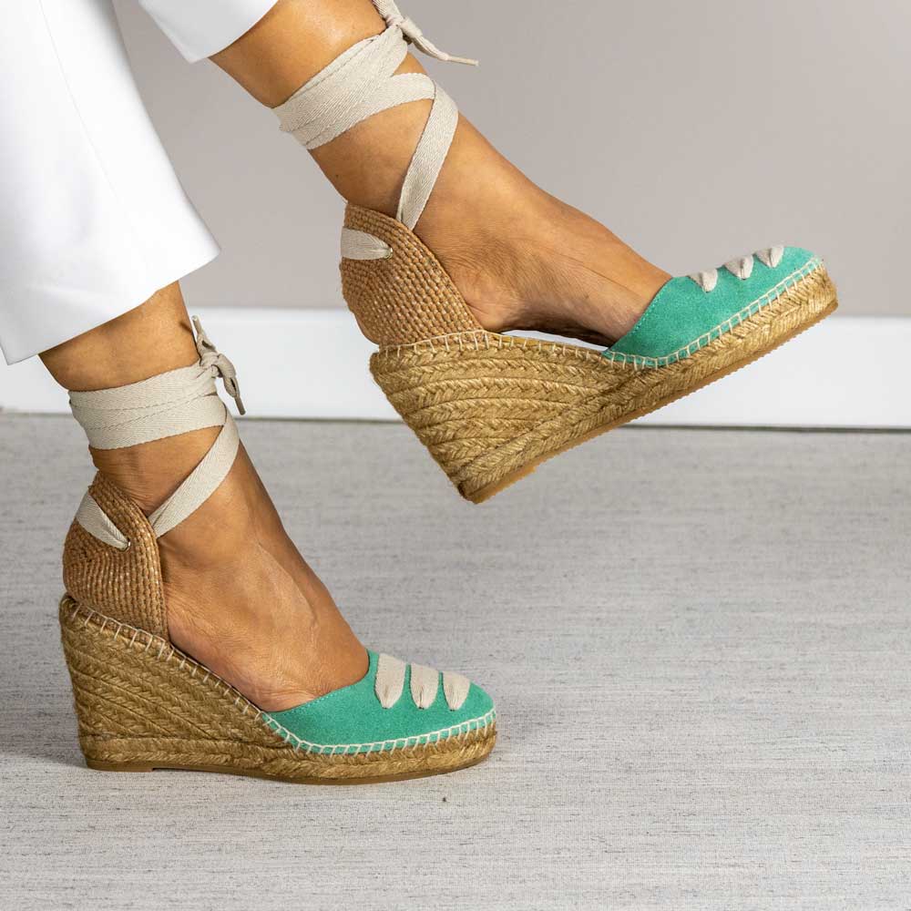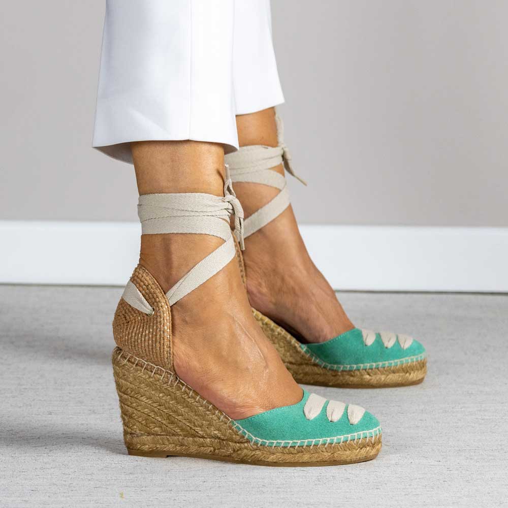 Alpargata con cuña elaborada en serraje. Talonera de tejido trenzado, y forrado para mayor resistencia y mayor comodidad ya que evita las arrugas en el talón. Cierre con cintas para atar al tobillo. Suela vulcanizada de yute teñido y caucho, forrada con piel y plantilla de látex, ofreciendo mayor confort al caminar. Altura de 9 cm, cuña de 7 cm y plataforma de 2 cm. Hechas totalmente a mano en España.