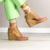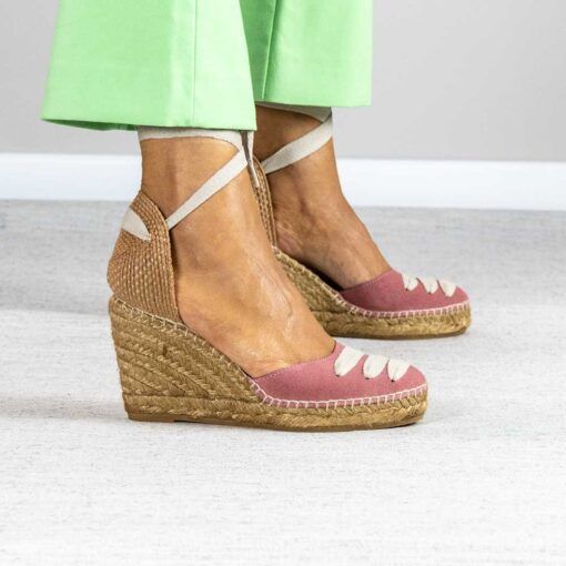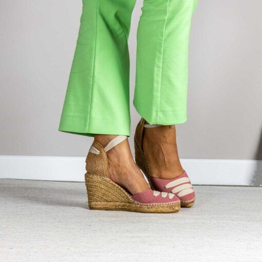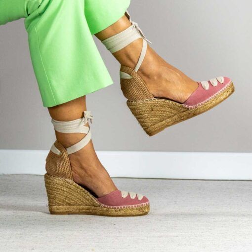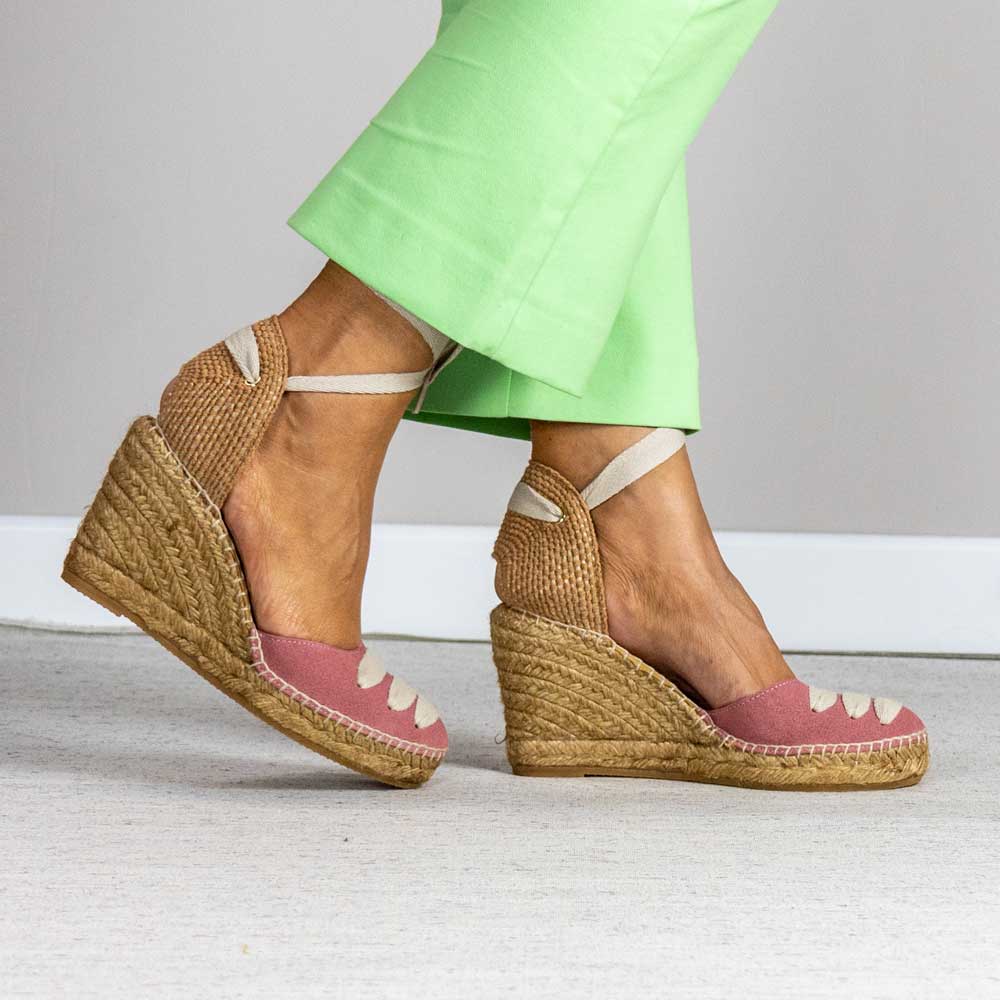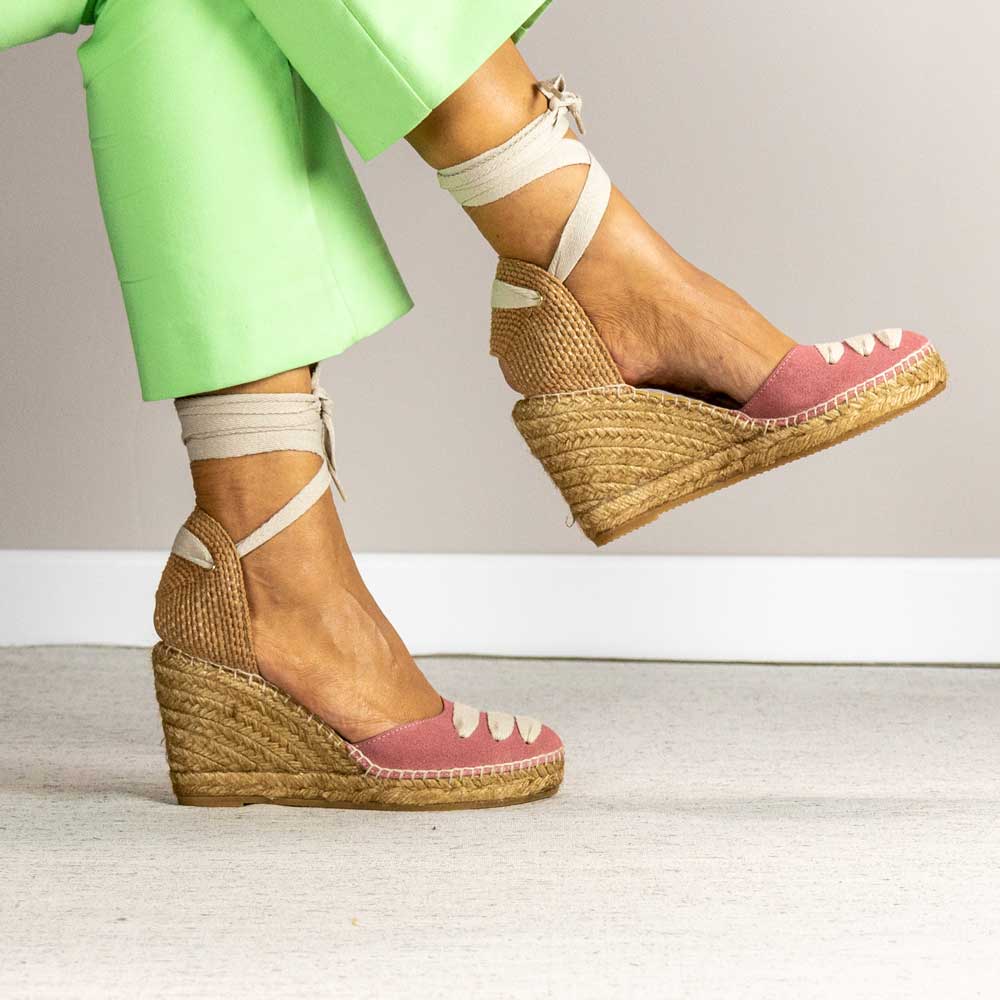 Alpargata con cuña elaborada en serraje. Talonera de tejido trenzado, y forrado para mayor resistencia y mayor comodidad ya que evita las arrugas en el talón. Cierre con cintas para atar al tobillo. Suela vulcanizada de yute teñido y caucho, forrada con piel y plantilla de látex, ofreciendo mayor confort al caminar. Altura de 9 cm, cuña de 7 cm y plataforma de 2 cm. Hechas totalmente a mano en España.