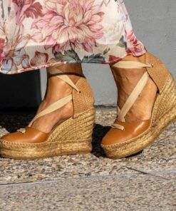 Alpargata con cuña elaborada en napa. Talonera de tejido trenzado, y forrado para mayor resistencia y mayor comodidad ya que evita las arrugas en el talón. Cierre con cintas desde el empeine para atar al tobillo. Suela vulcanizada de yute teñido y caucho, forrada con piel y plantilla de látex, ofreciendo mayor confort al caminar. Altura de 10 cm, cuña de 7 cm y plataforma de 3 cm. Hechas totalmente a mano en España.