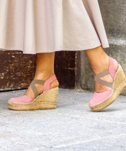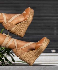 Alpargata con cuña elaborada en napa. Talonera de tejido trenzado, y forrado para mayor resistencia y mayor comodidad ya que evita las arrugas en el talón. Cierre con cintas desde el empeine para atar al tobillo. Suela vulcanizada de yute teñido y caucho, forrada con piel y plantilla de látex, ofreciendo mayor confort al caminar. Altura de 10 cm, cuña de 7 cm y plataforma de 3 cm. Hechas totalmente a mano en España.