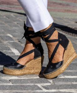 Alpargata con cuña elaborada en serraje. Cierre con cintas . Suela vulcanizada de yute teñido y caucho, forrada con microfibra y plantilla de látex, ofreciendo mayor confort al caminar. Altura de 9 cm, cuña de 7 cm y plataforma de 2 cm. Hechas totalmente a mano en España.