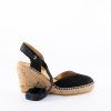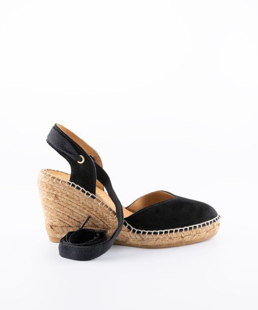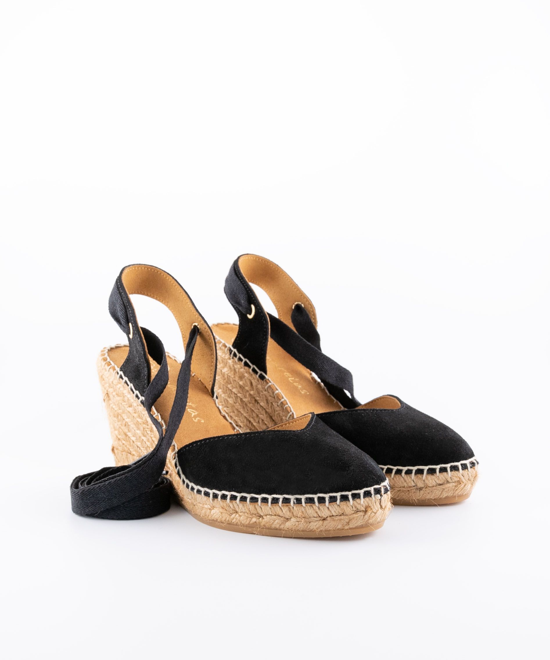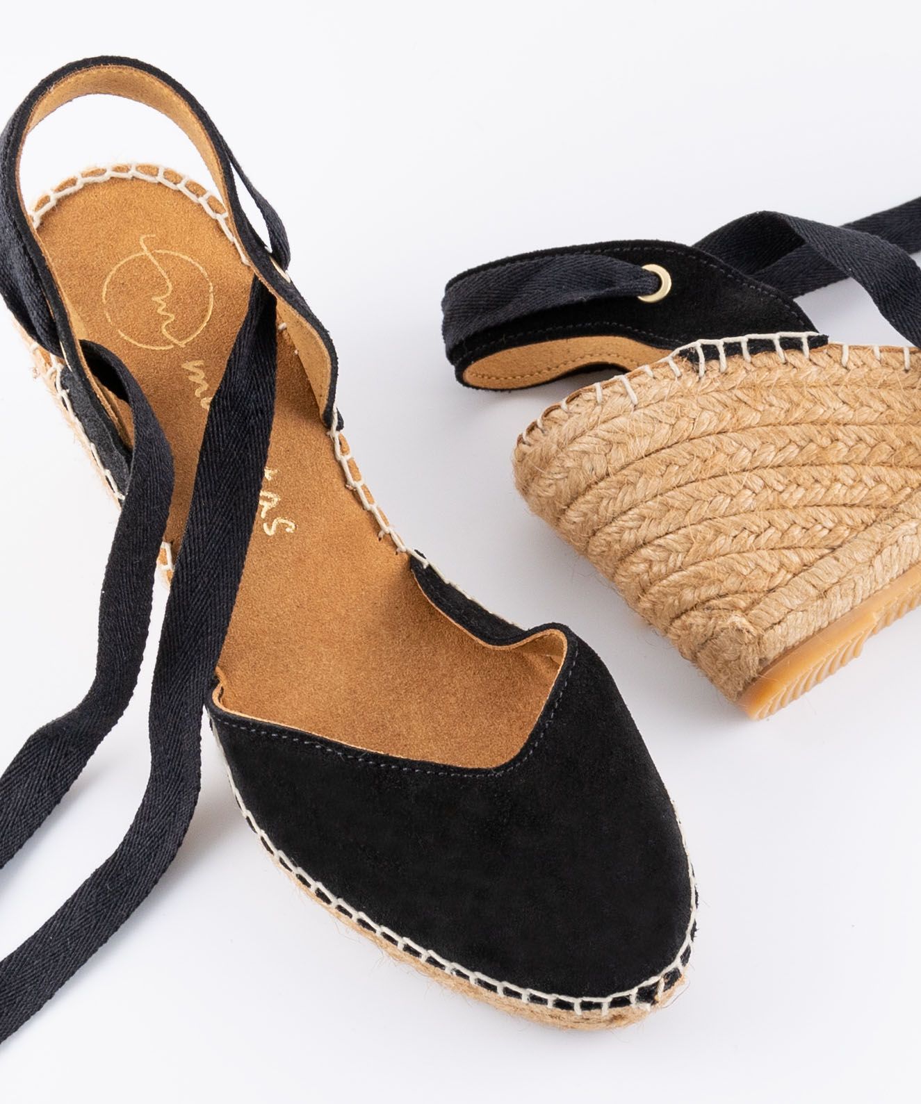 Alpargata con cuña elaborada en serraje. Cierre con cintas . Suela vulcanizada de yute teñido y caucho, forrada con microfibra y plantilla de látex, ofreciendo mayor confort al caminar. Altura de 9 cm, cuña de 7 cm y plataforma de 2 cm. Hechas totalmente a mano en España.