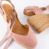 Alpargata con cuña elaborada en serraje. Cierre con cintas . Suela vulcanizada de yute teñido y caucho, forrada con microfibra y plantilla de látex, ofreciendo mayor confort al caminar. Altura de 9 cm, cuña de 7 cm y plataforma de 2 cm. Hechas totalmente a mano en España.