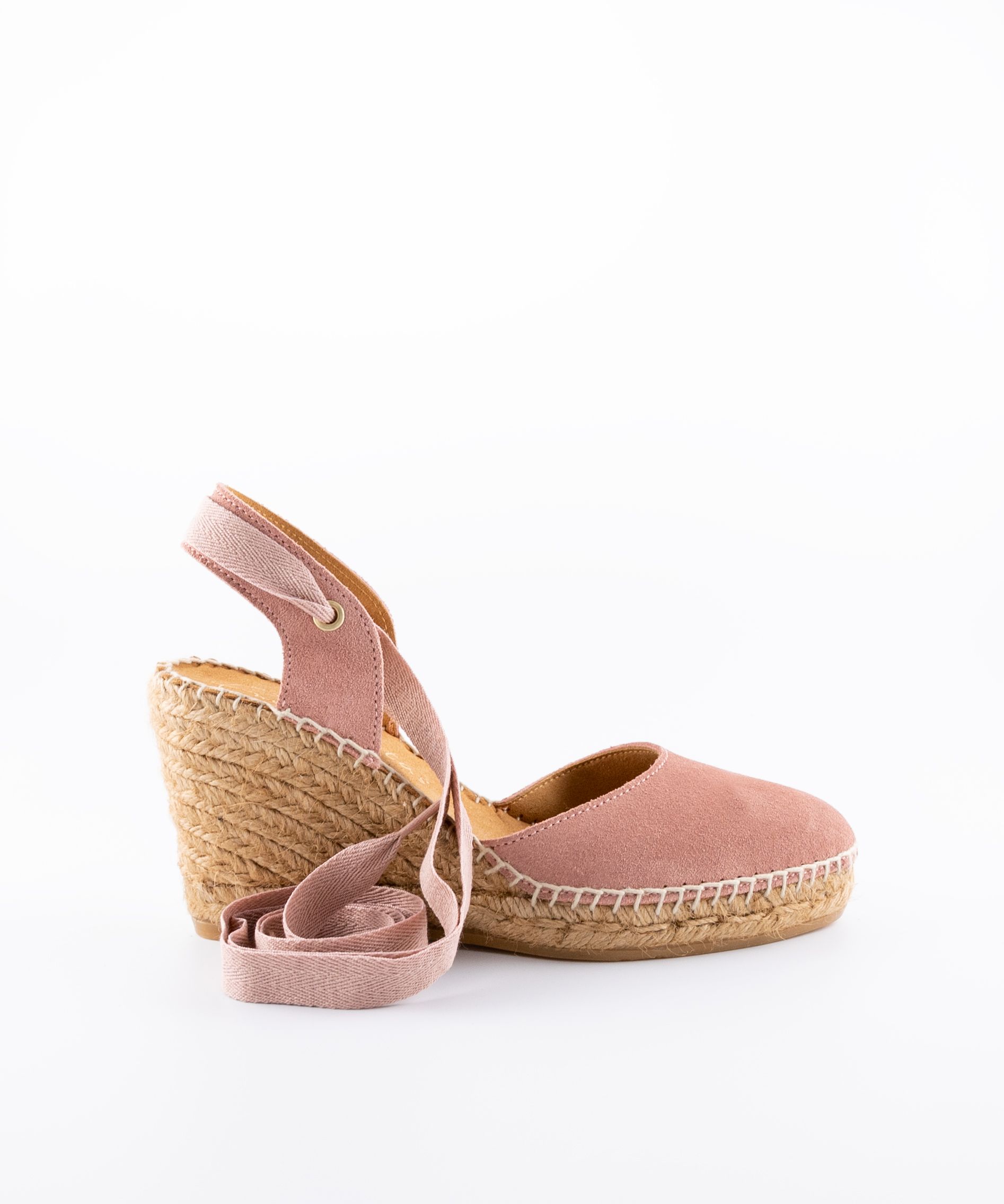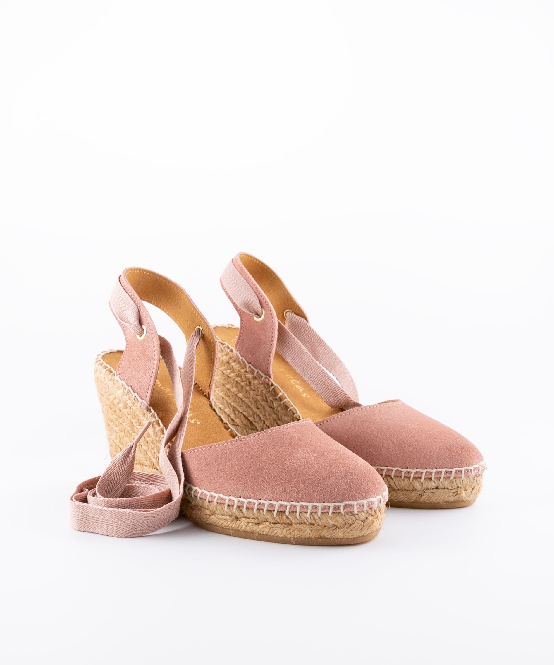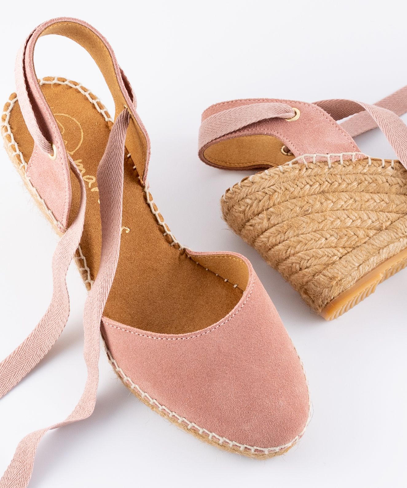 Alpargata con cuña elaborada en serraje. Cierre con cintas . Suela vulcanizada de yute teñido y caucho, forrada con microfibra y plantilla de látex, ofreciendo mayor confort al caminar. Altura de 9 cm, cuña de 7 cm y plataforma de 2 cm. Hechas totalmente a mano en España.