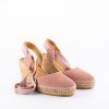 Alpargata con cuña elaborada en serraje. Cierre con cintas . Suela vulcanizada de yute teñido y caucho, forrada con microfibra y plantilla de látex, ofreciendo mayor confort al caminar. Altura de 9 cm, cuña de 7 cm y plataforma de 2 cm. Hechas totalmente a mano en España.