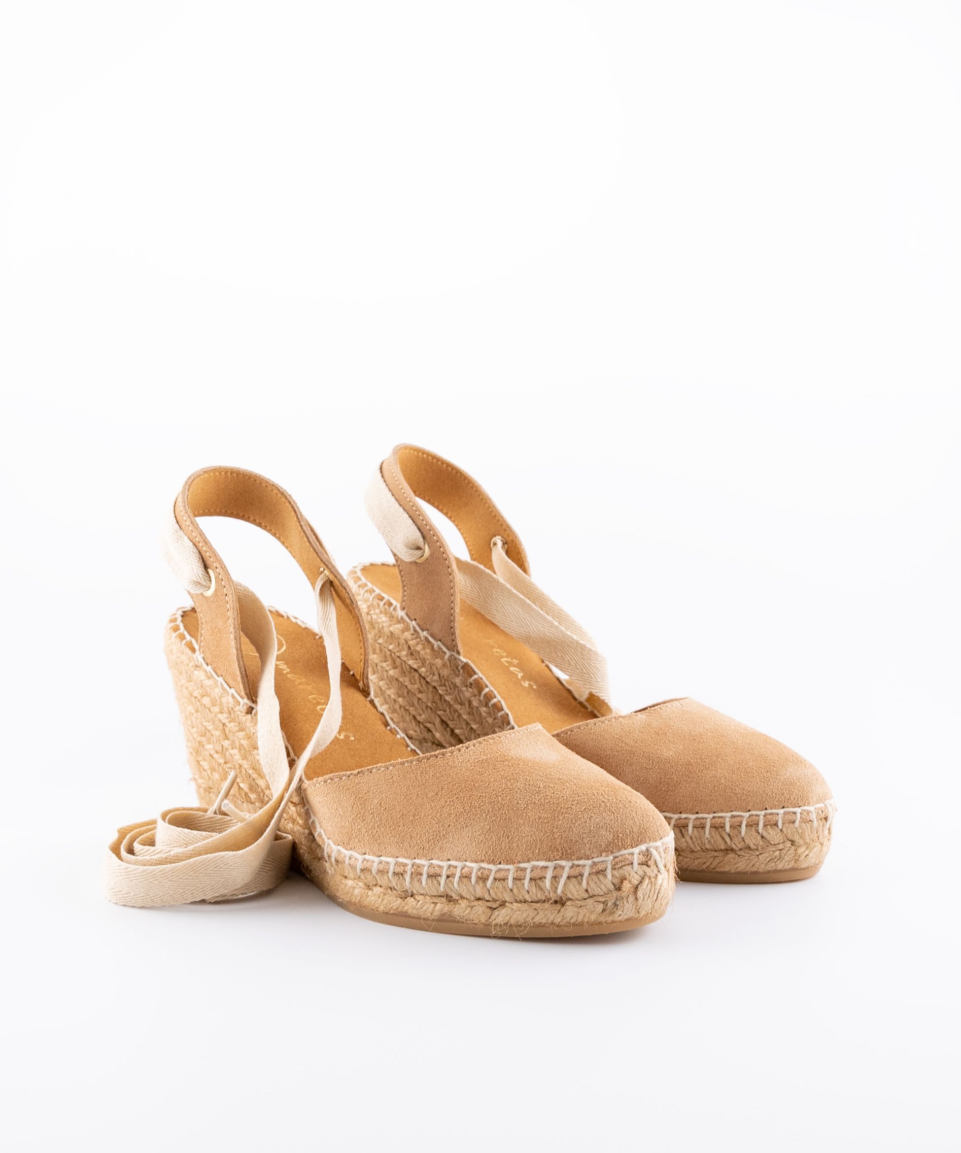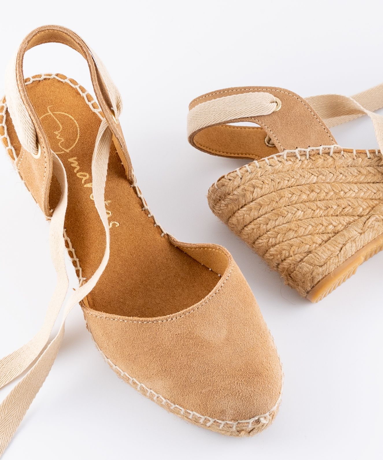Alpargata con cuña elaborada en serraje. Cierre con cintas . Suela vulcanizada de yute teñido y caucho, forrada con microfibra y plantilla de látex, ofreciendo mayor confort al caminar. Altura de 9 cm, cuña de 7 cm y plataforma de 2 cm. Hechas totalmente a mano en España.