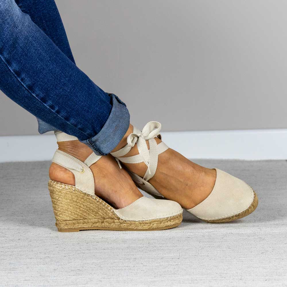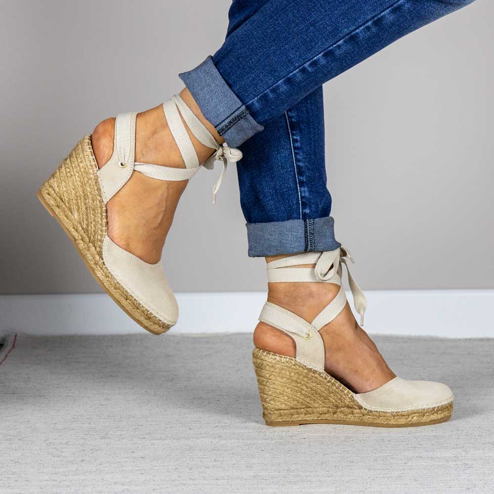 Alpargata con cuña elaborada en serraje. Cierre con cintas . Suela vulcanizada de yute teñido y caucho, forrada con microfibra y plantilla de látex, ofreciendo mayor confort al caminar. Altura de 9 cm, cuña de 7 cm y plataforma de 2 cm. Hechas totalmente a mano en España.