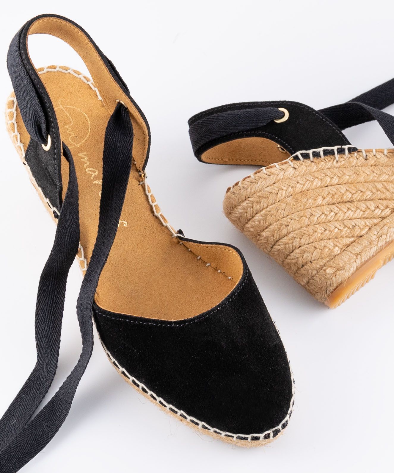 Alpargata con cuña elaborada en serraje. Cierre con cintas . Suela vulcanizada de yute teñido y caucho, forrada con microfibra y plantilla de látex, ofreciendo mayor confort al caminar. Altura de 9 cm, cuña de 7 cm y plataforma de 2 cm. Hechas totalmente a mano en España.