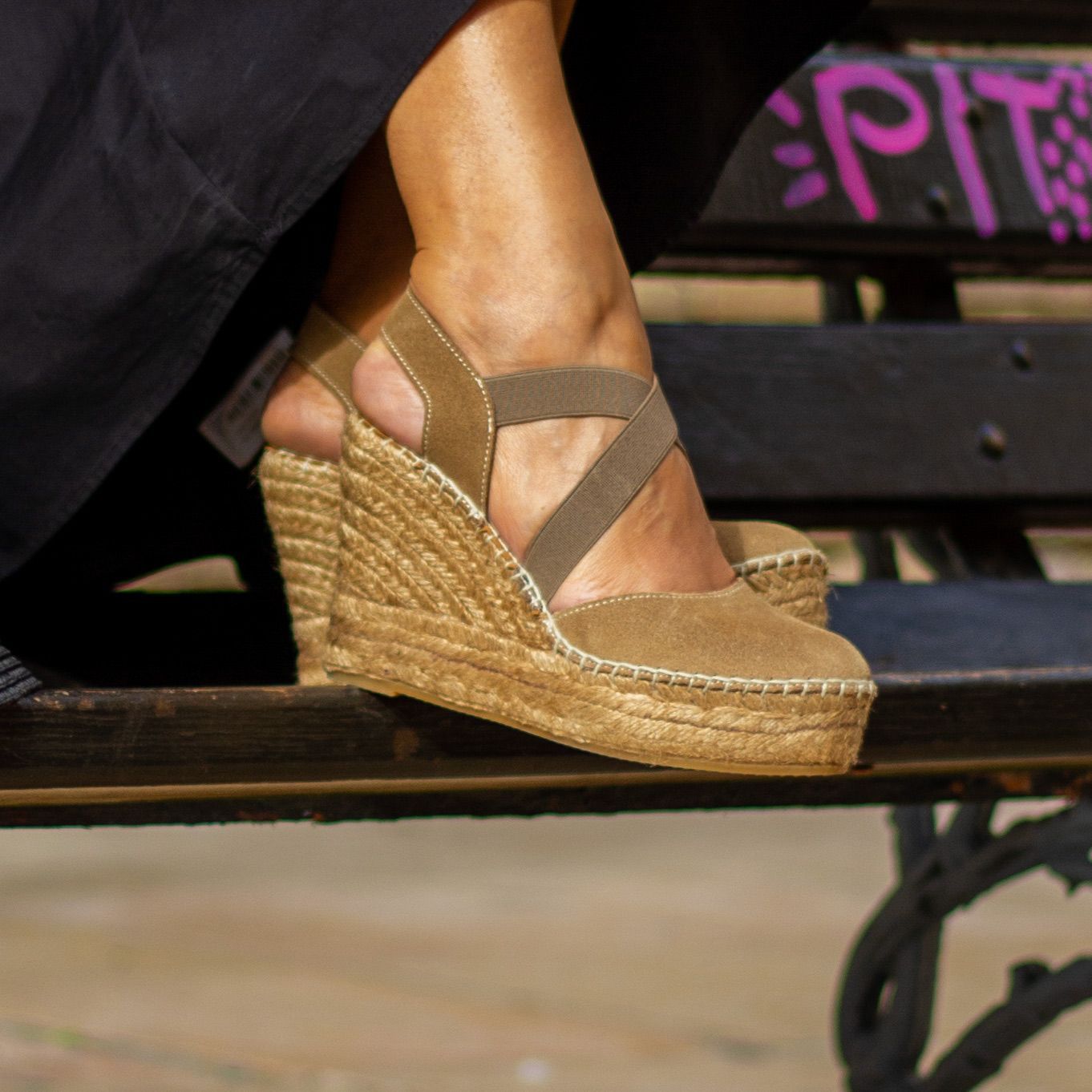 Alpargata con cuña elaborada en serraje. Cierre con gomas , proporcionando un ajuste perfecto . Suela vulcanizada de yute teñido y caucho, forrada con microfibra y plantilla de látex, ofreciendo mayor confort al caminar. Altura de 10 cm, cuña de 7 cm y plataforma de 3 cm. Hechas totalmente a mano en España.
