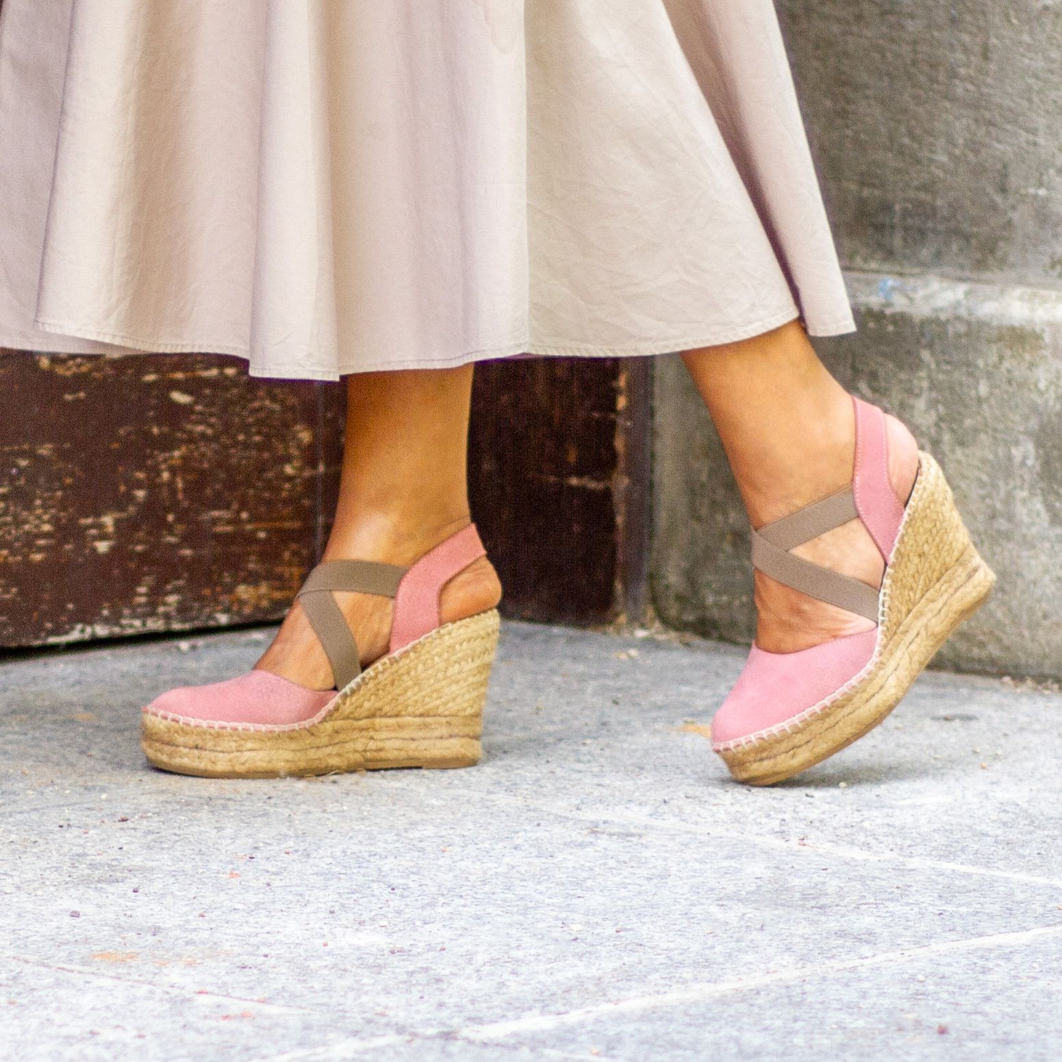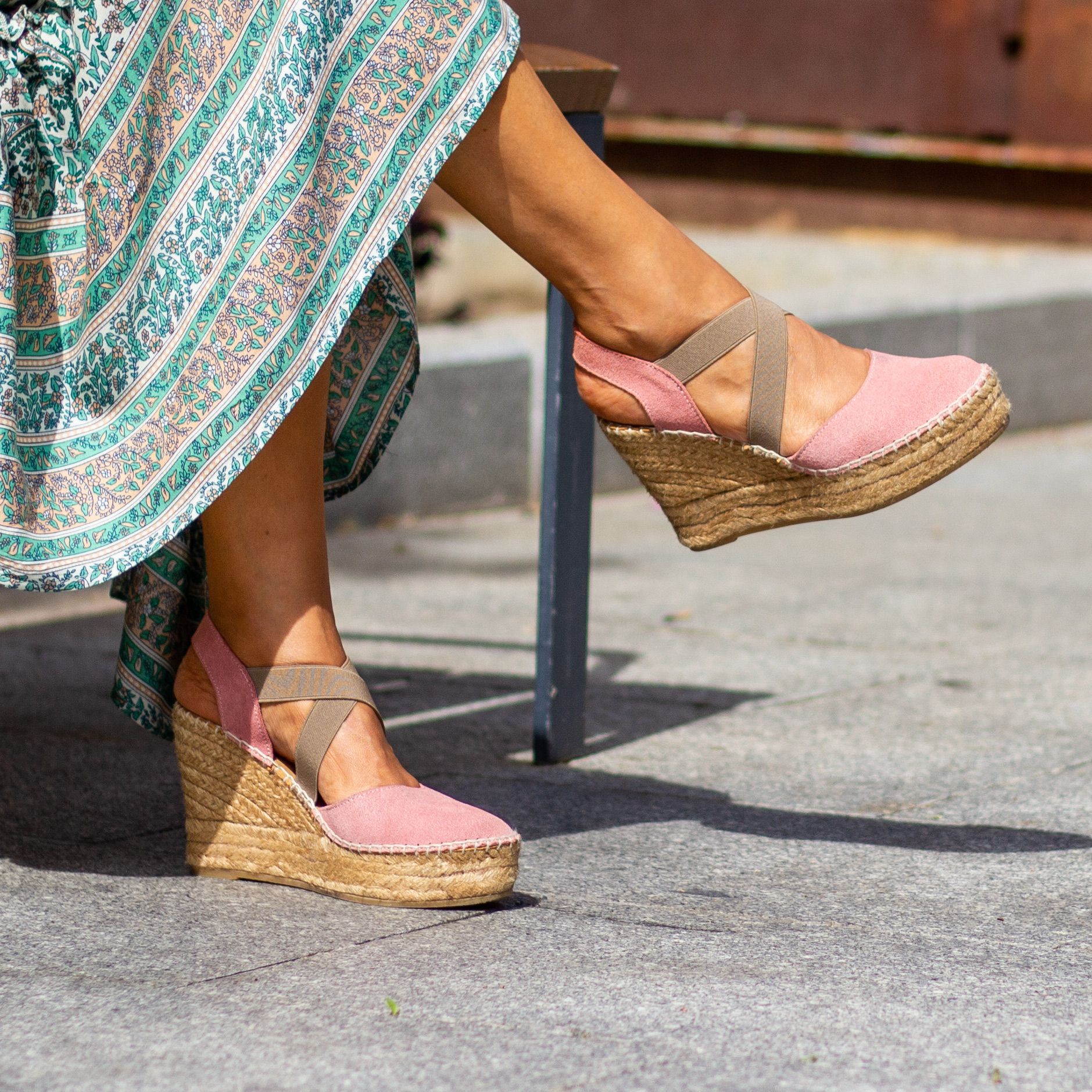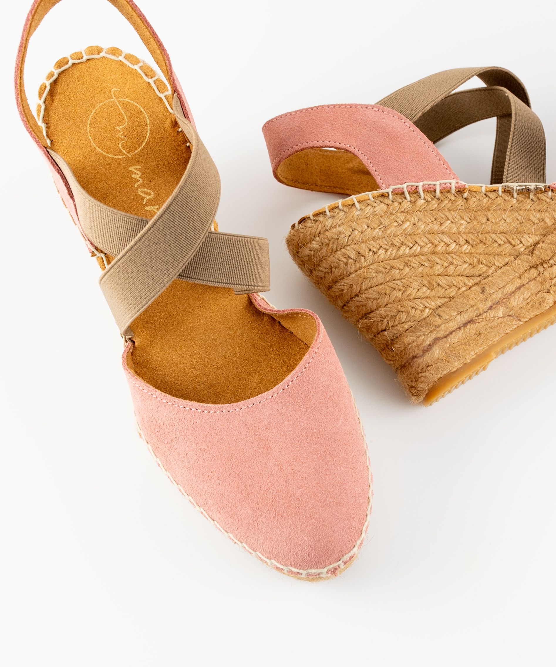 Alpargata con cuña elaborada en serraje. Cierre con gomas , proporcionando un ajuste perfecto . Suela vulcanizada de yute teñido y caucho, forrada con microfibra y plantilla de látex, ofreciendo mayor confort al caminar. Altura de 10 cm, cuña de 7 cm y plataforma de 3 cm. Hechas totalmente a mano en España.