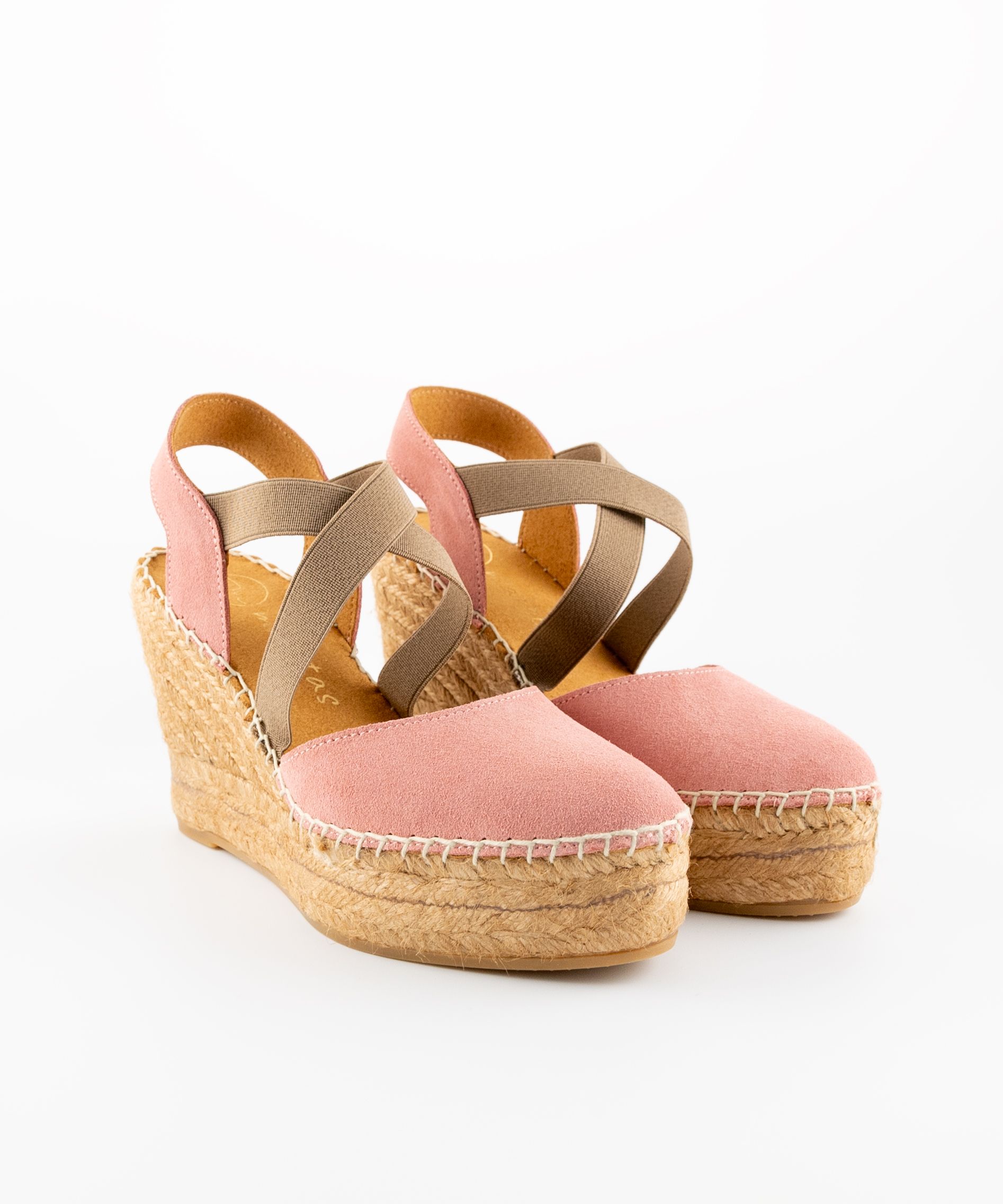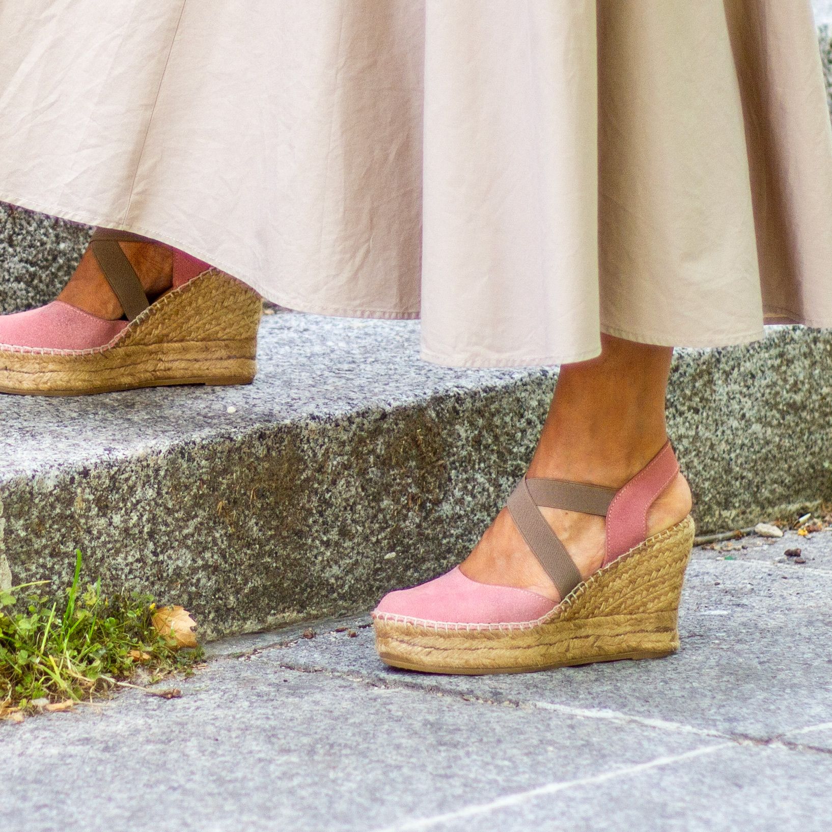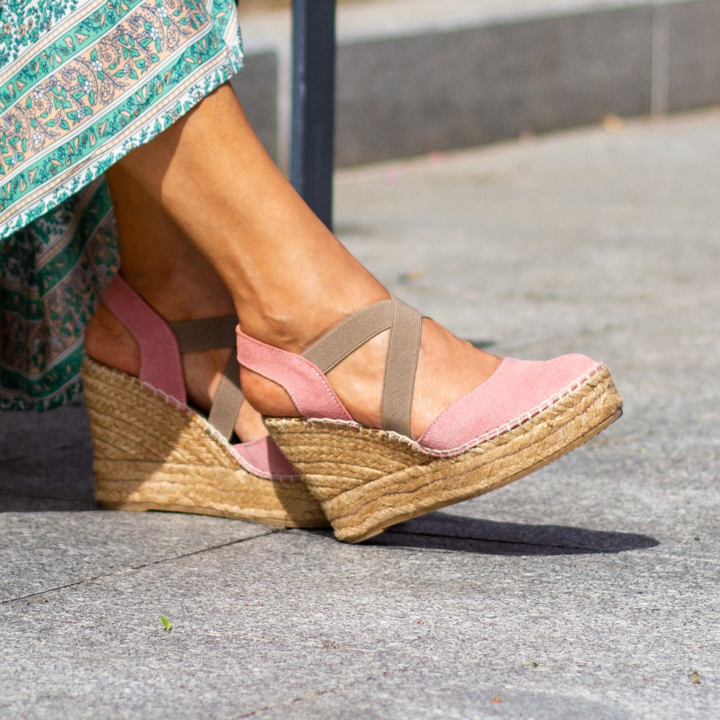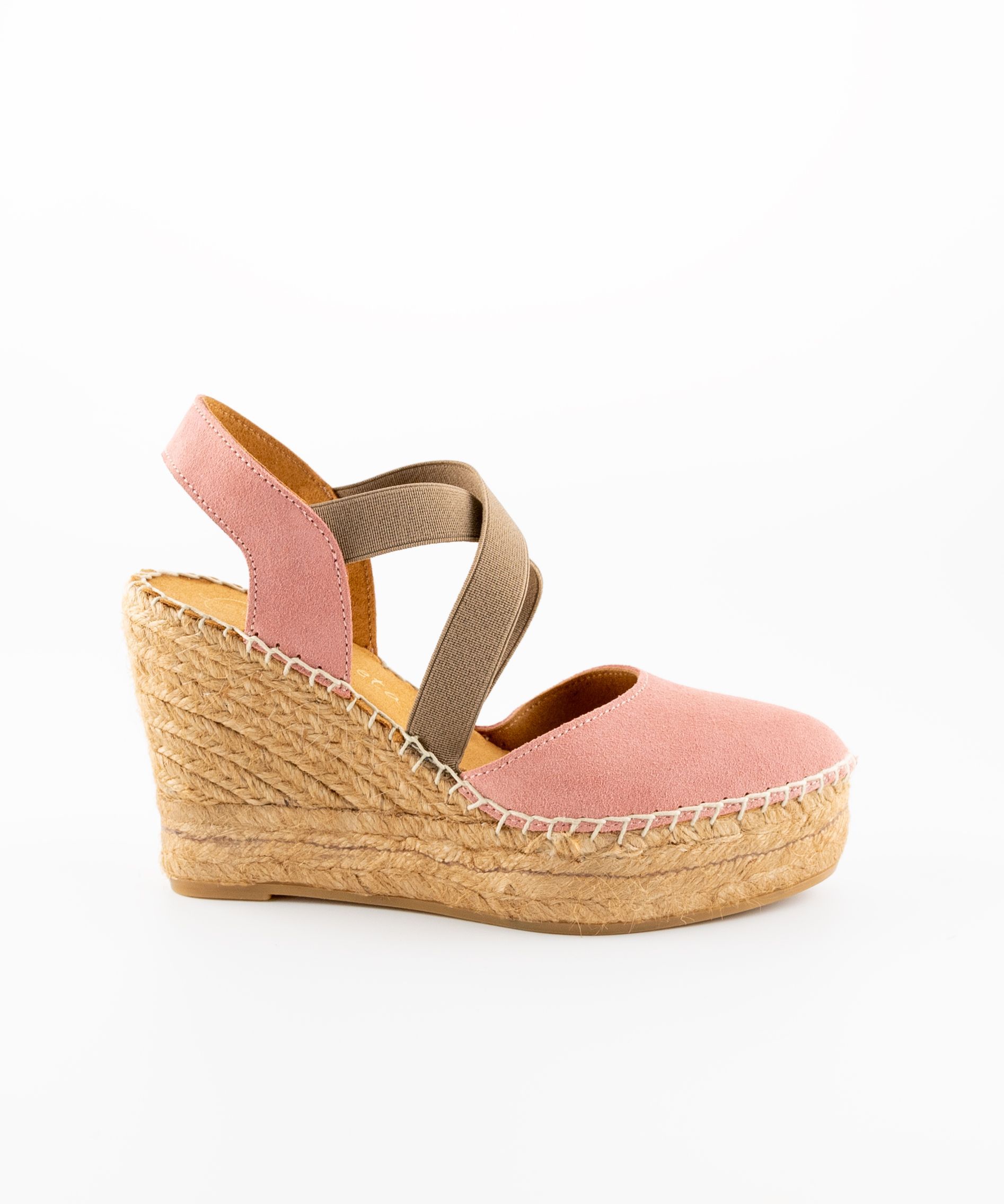 Alpargata con cuña elaborada en serraje. Cierre con gomas , proporcionando un ajuste perfecto . Suela vulcanizada de yute teñido y caucho, forrada con microfibra y plantilla de látex, ofreciendo mayor confort al caminar. Altura de 10 cm, cuña de 7 cm y plataforma de 3 cm. Hechas totalmente a mano en España.