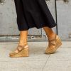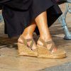 Alpargata con cuña elaborada en serraje. Cierre con gomas , proporcionando un ajuste perfecto . Suela vulcanizada de yute teñido y caucho, forrada con microfibra y plantilla de látex, ofreciendo mayor confort al caminar. Altura de 10 cm, cuña de 7 cm y plataforma de 3 cm. Hechas totalmente a mano en España.