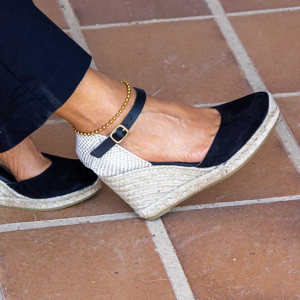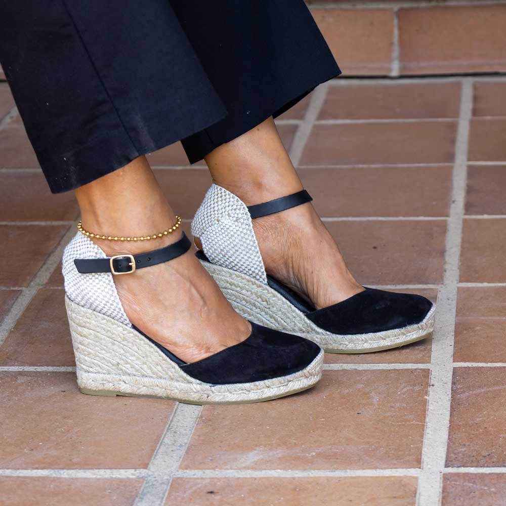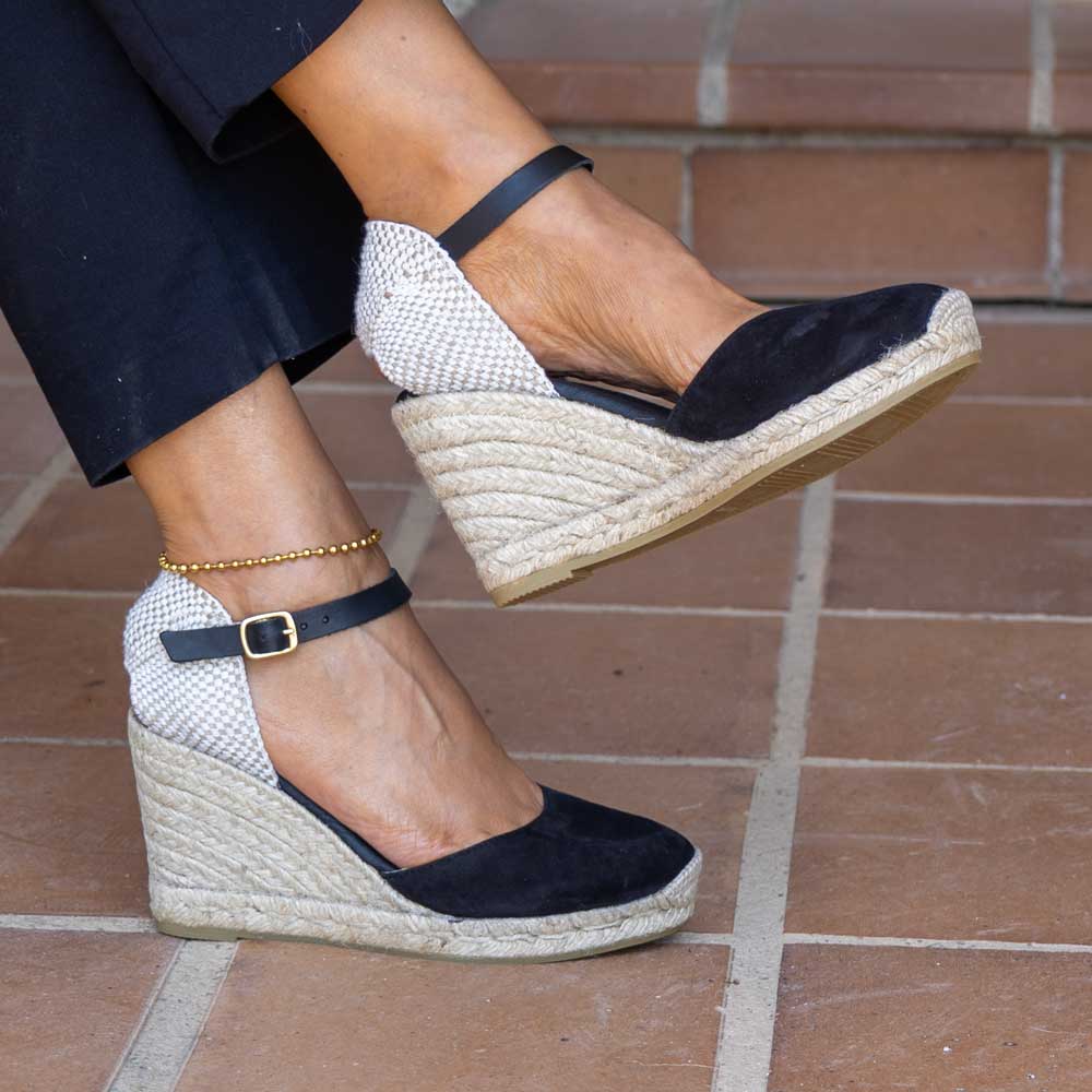 Alpargata con cuña elaborada en serraje . Suela vulcanizada de yute teñido y caucho, forrada con microfibra y plantilla conford, ofreciendo mayor confort al caminar. Altura de 9 cm, cuña de 7 cm y plataforma de 2 cm. Hechas totalmente a mano en España.