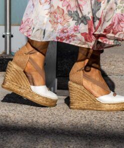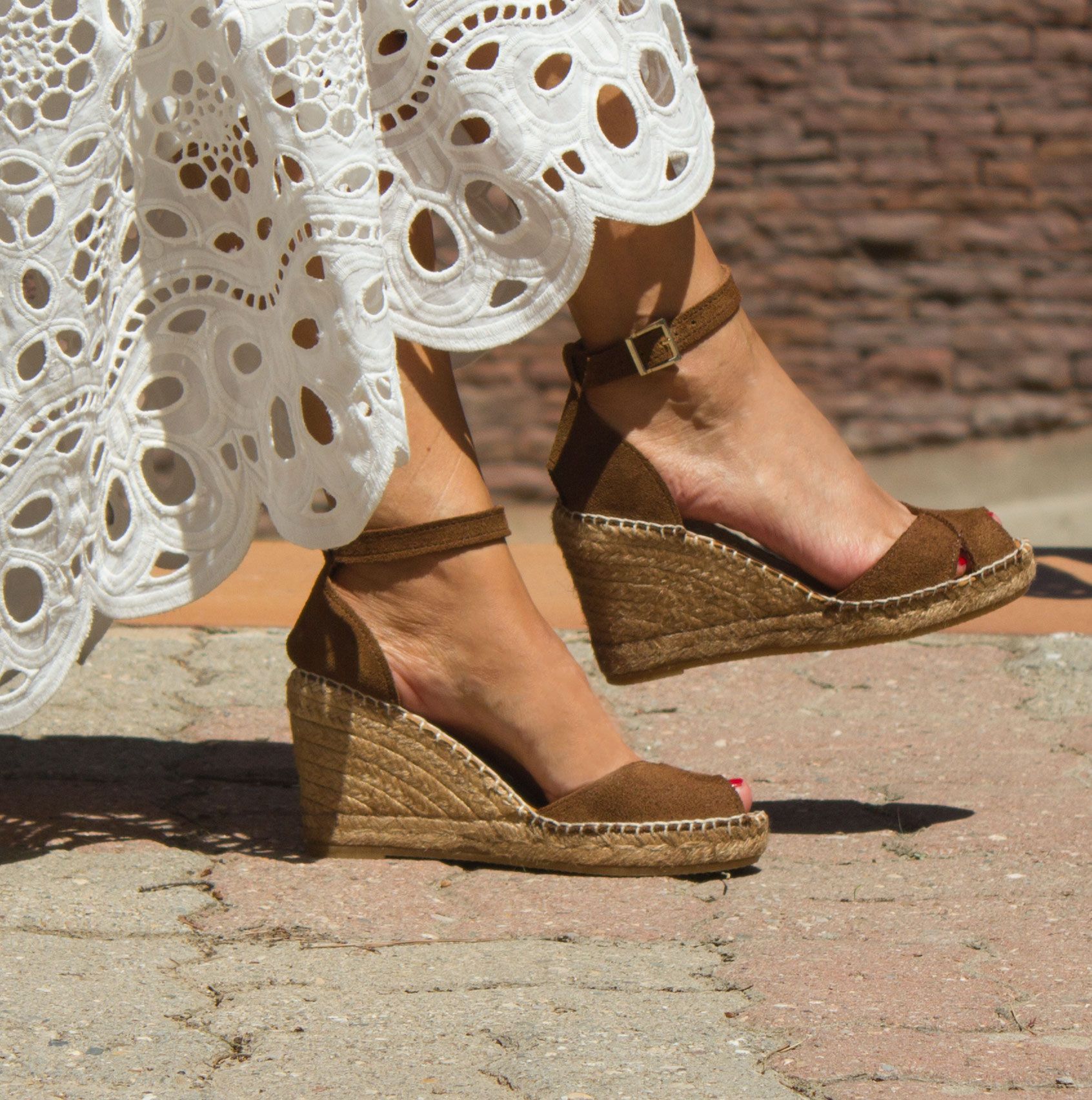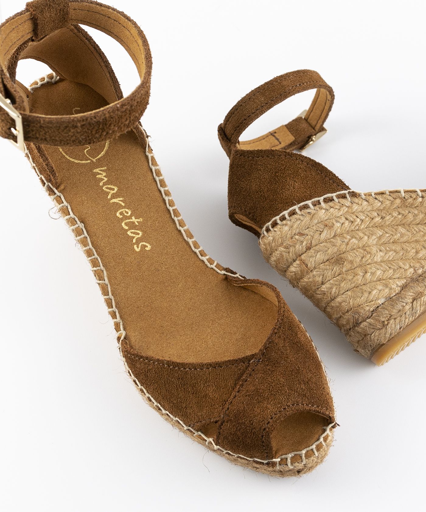 Alpargata con cuña elaborada en serraje. Talonera forrada para mayor resistencia y mayor comodidad ya que evita las arrugas en el talón. Cierre con pulsera al tobillo ajustable y hebilla, facilitando la sujeción al pie. Suela vulcanizada de yute teñido y caucho, forrada con piel y plantilla de látex, ofreciendo mayor confort al caminar. Altura de 9 cm, cuña de 7 cm y plataforma de 2 cm. Hechas totalmente a mano en España.