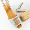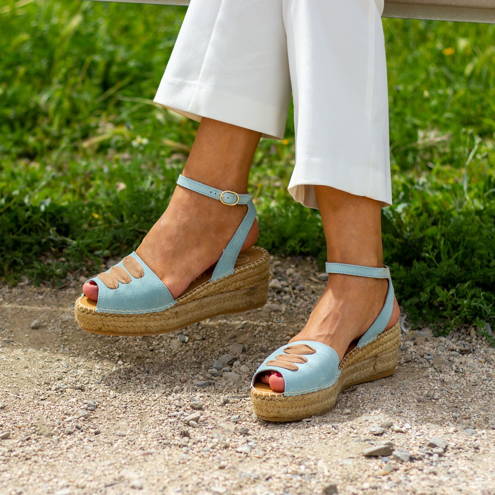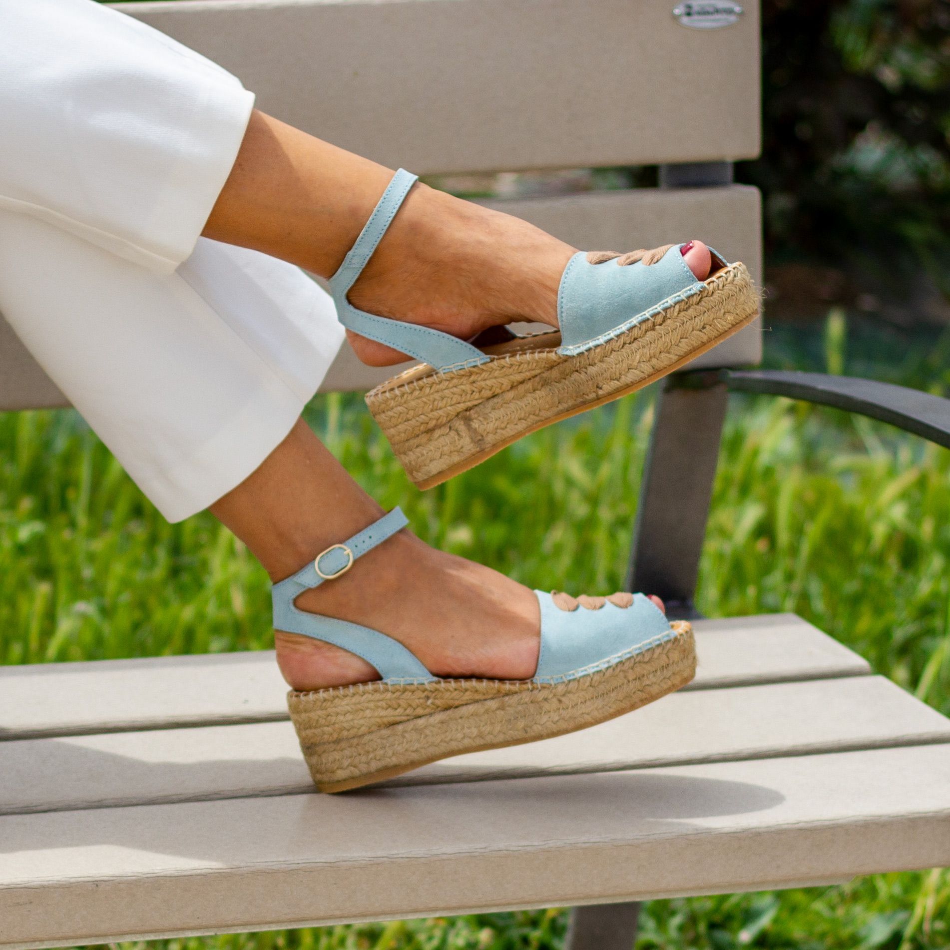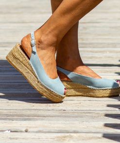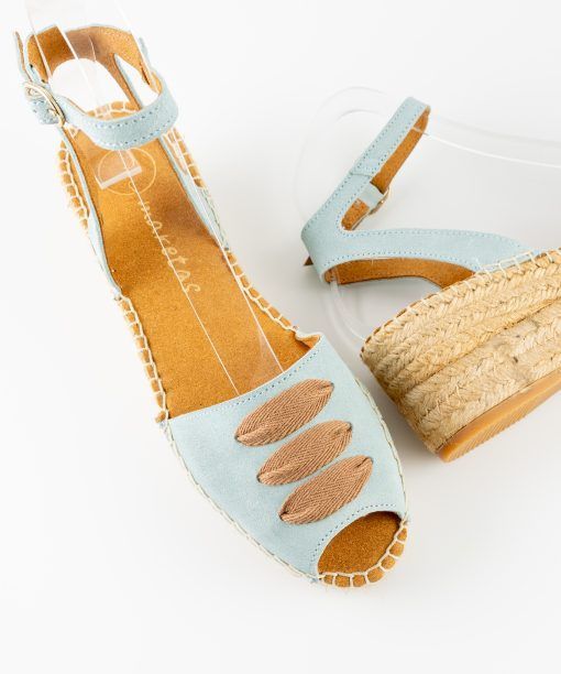 Alpargata con cuña elaborada en serraje. Talonera de piel . Suela vulcanizada de yute teñido y caucho, forrada con microfibra y plantilla de látex, ofreciendo mayor confort al caminar. Altura de 6 cm, cuña de 3 cm y plataforma de 3 cm. Hechas totalmente a mano en España.