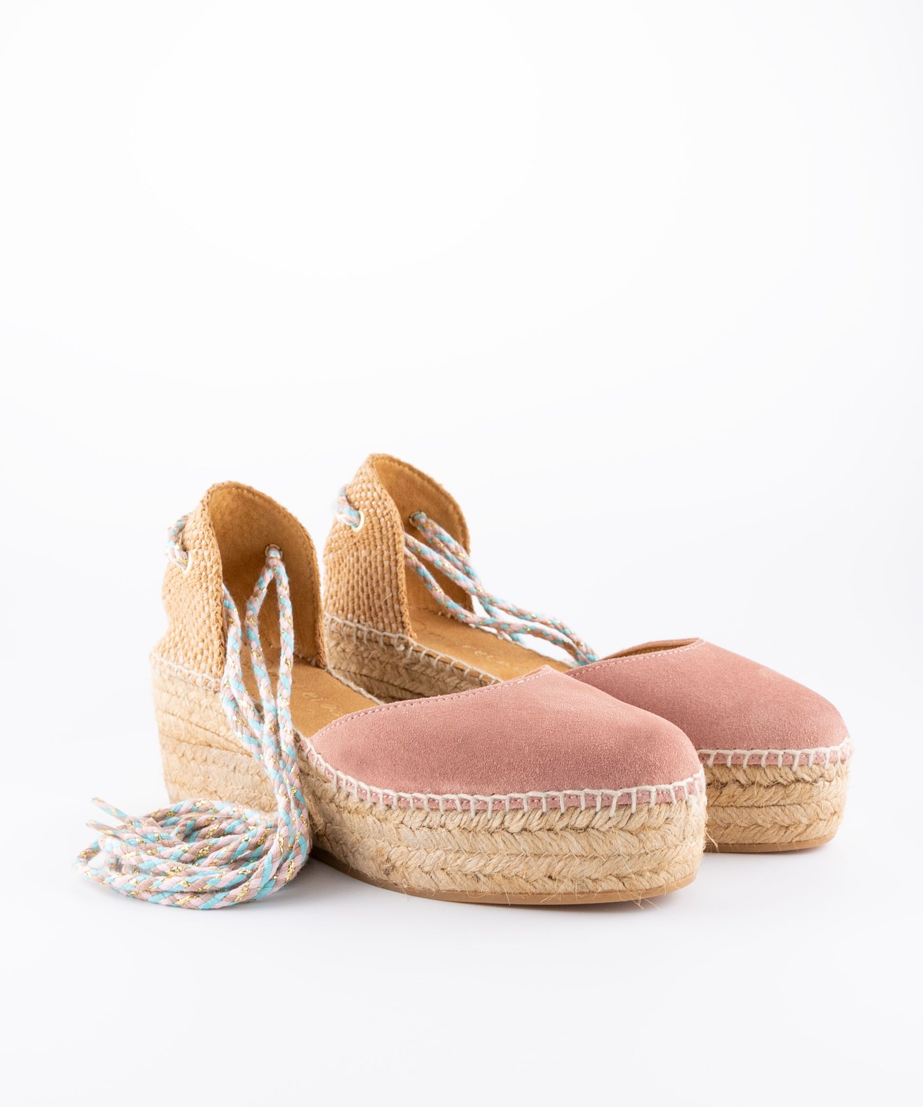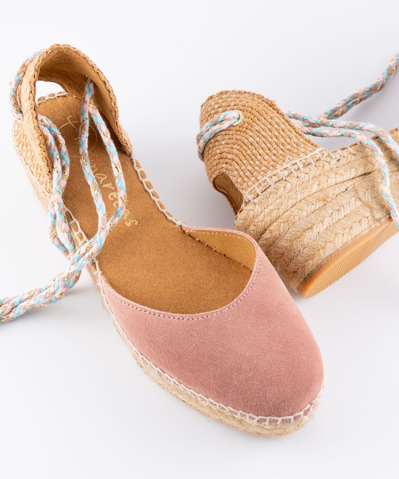 Alpargata con cuña elaborada en serraje. Talonera de tejido trenzado, y forrado para mayor resistencia y mayor comodidad ya que evita las arrugas en el talón. Cierre con cintas . Suela vulcanizada de yute teñido y caucho, forrada con microfibra y plantilla de látex, ofreciendo mayor confort al caminar. Altura de 6 cm, cuña de 3 cm y plataforma de 3 cm. Hechas totalmente a mano en España.