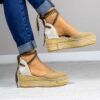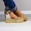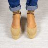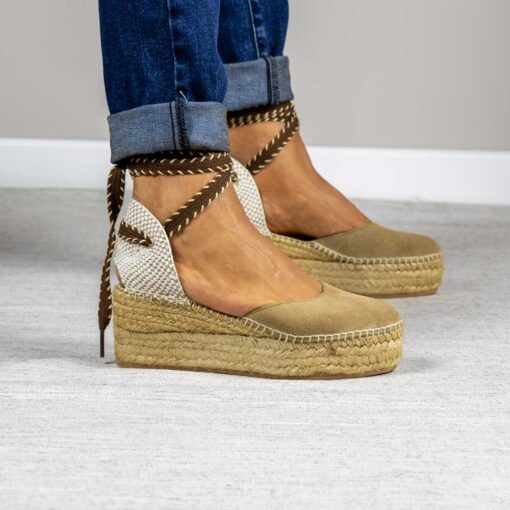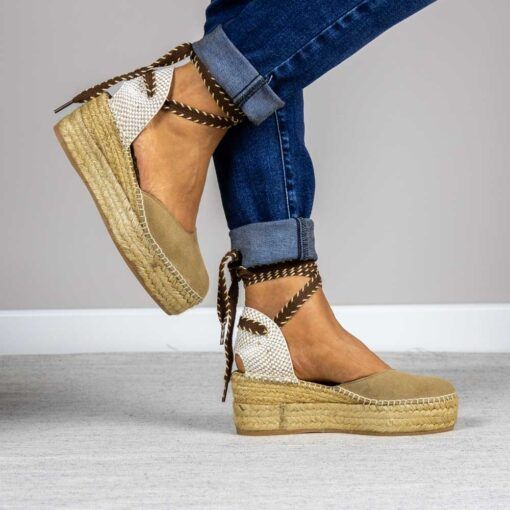 Alpargata con cuña elaborada en piel de serraje. Talonera forrada de tejido . Suela vulcanizada de yute teñido y caucho, forrada con microfibra y plantilla de látex gel, ofreciendo mayor confort al caminar. Altura de 6 cm, cuña de 3 cm y plataforma de 3 cm. Hechas totalmente a mano en España.