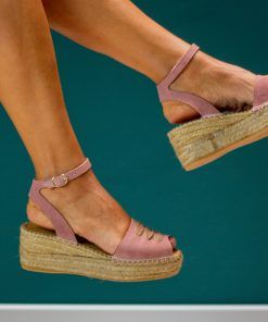 Alpargata con cuña elaborada en serraje. Talonera forrada de tejido . Suela vulcanizada de yute teñido y caucho, forrada con microfibra y plantilla de látex, ofreciendo mayor confort al caminar. Altura de 6 cm, cuña de 3 cm y plataforma de 3 cm. Hechas totalmente a mano en España.