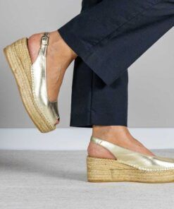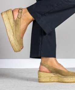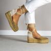 Alpargata con cuña elaborada en serraje. Talonera forrada de tejido . Suela vulcanizada de yute teñido y caucho, forrada con microfibra y plantilla de látex, ofreciendo mayor confort al caminar. Altura de 6 cm, cuña de 3 cm y plataforma de 3 cm. Hechas totalmente a mano en España.