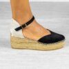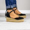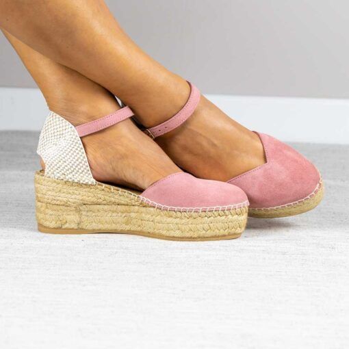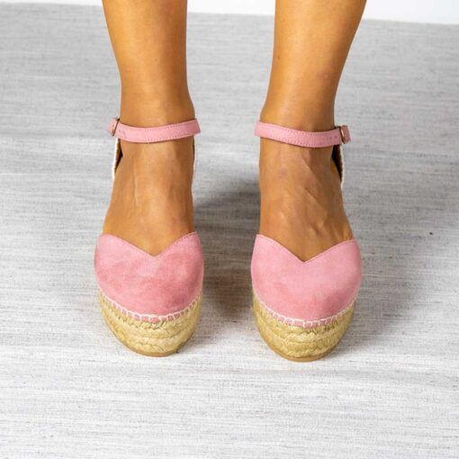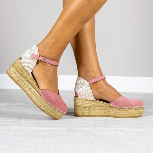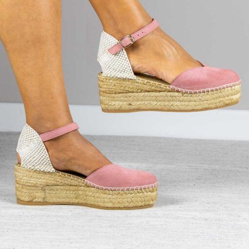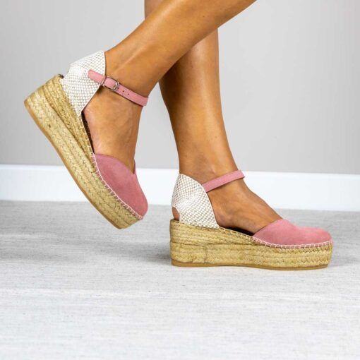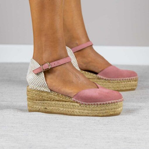 Alpargata con cuña elaborada en piel de serraje. Talonera forrada de tejido . Suela vulcanizada de yute teñido y caucho, forrada con microfibra y plantilla de látex gel, ofreciendo mayor confort al caminar. Altura de 6 cm, cuña de 3 cm y plataforma de 3 cm. Hechas totalmente a mano en España.