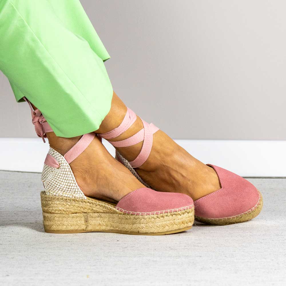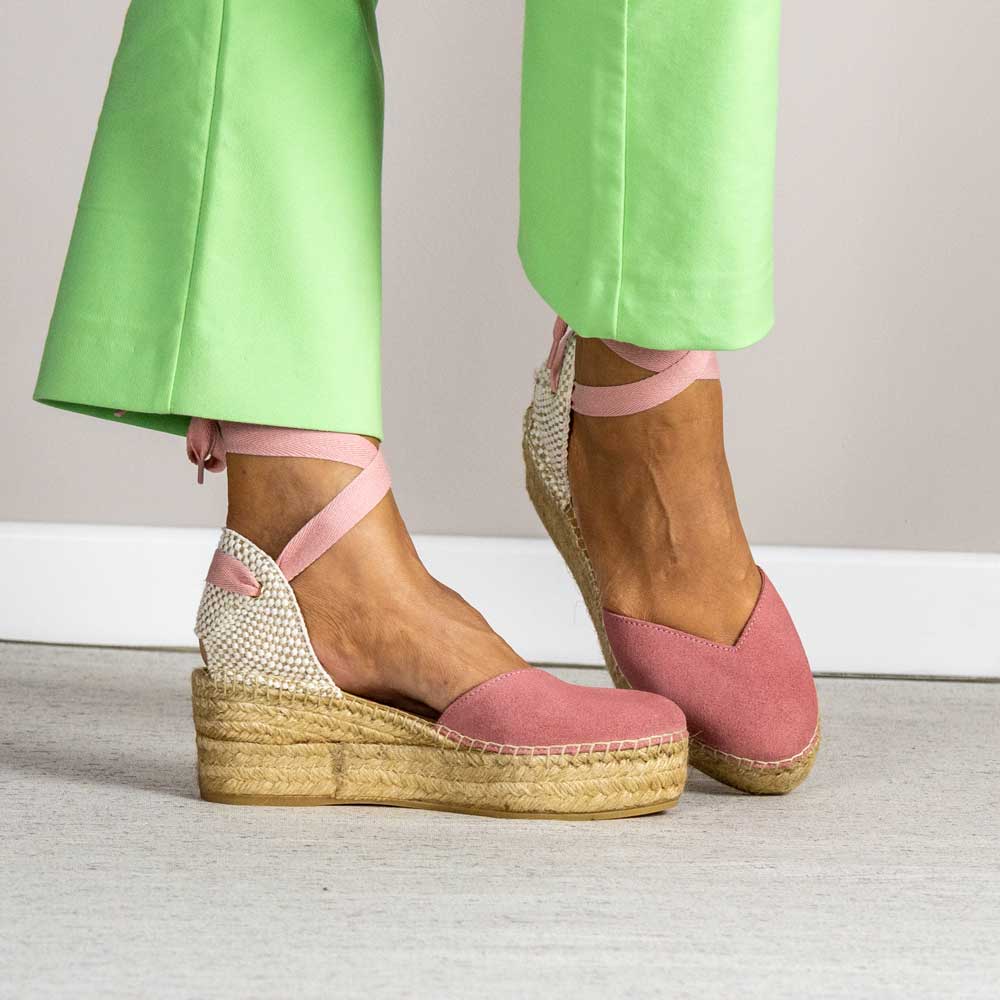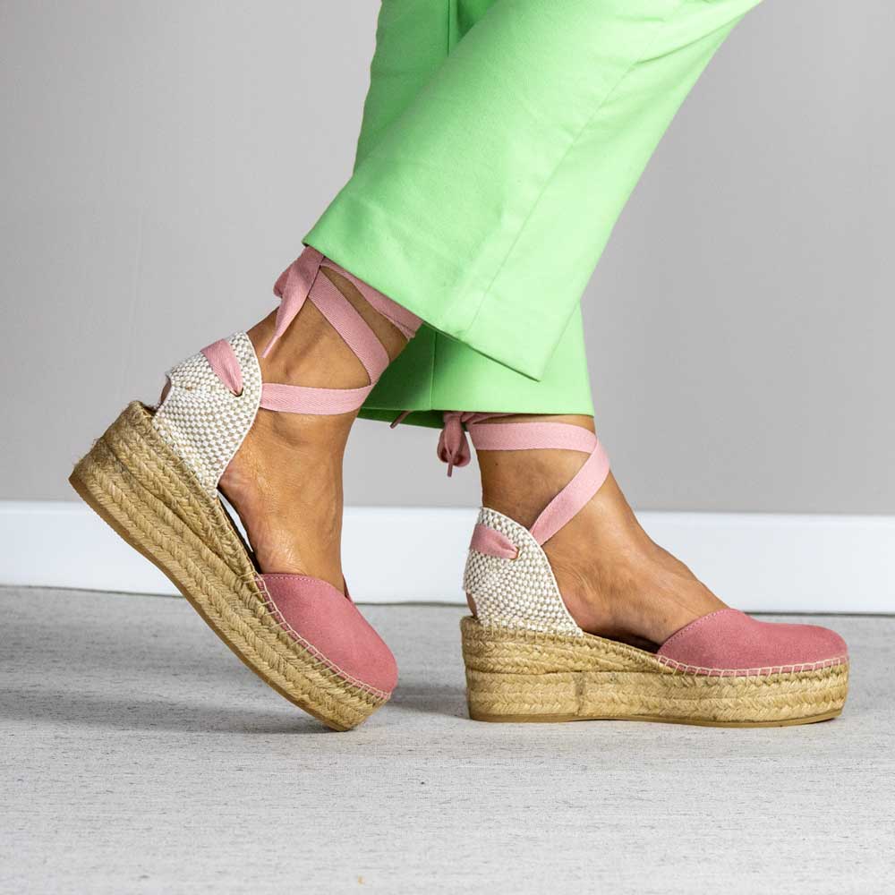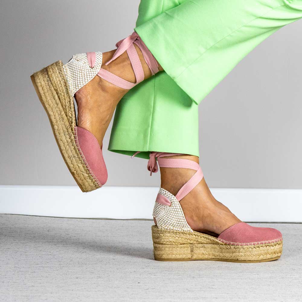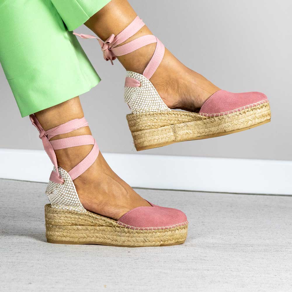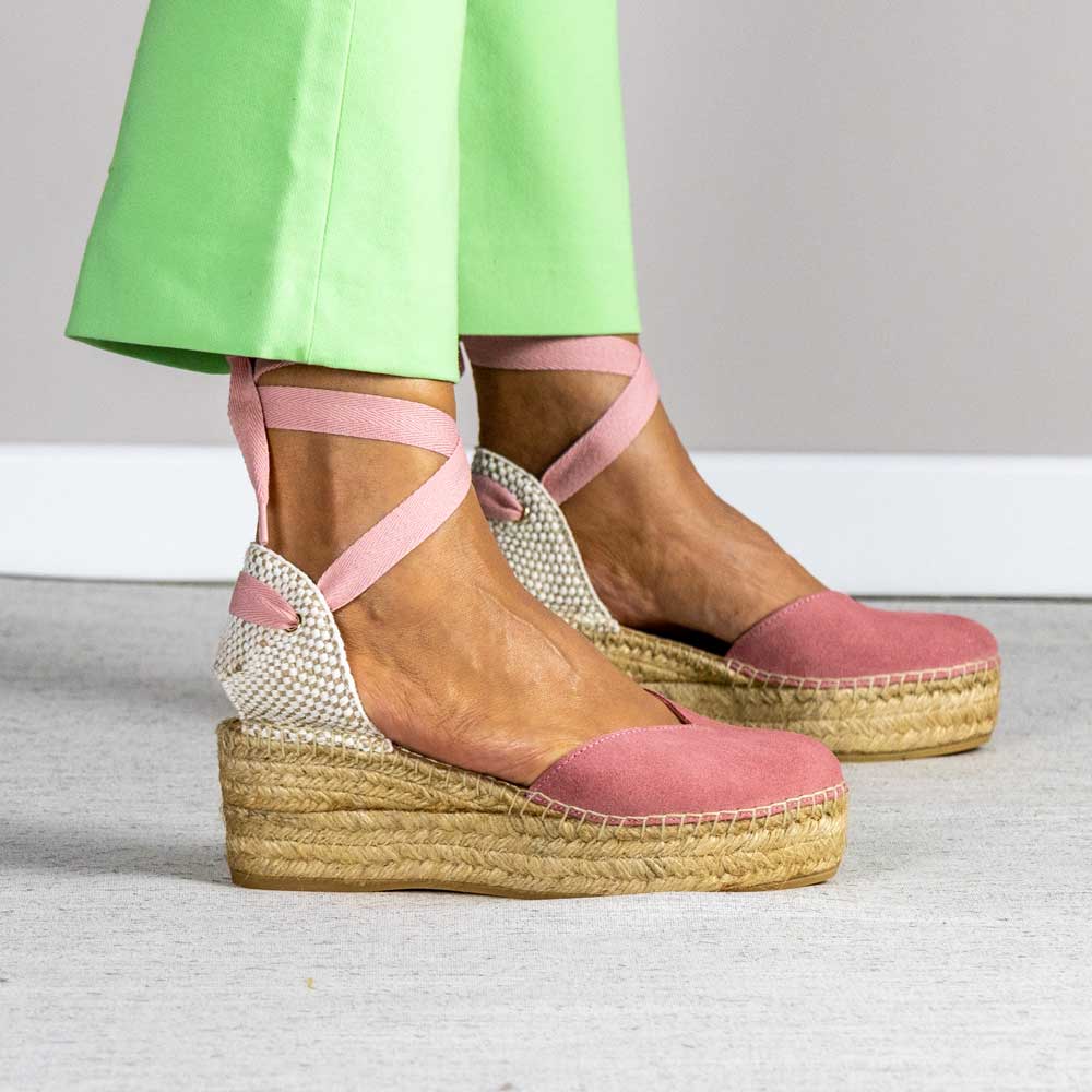 Alpargata con cuña elaborada en serraje. Talonera forrada de tejido . Suela vulcanizada de yute teñido y caucho, forrada con microfibra y plantilla de látex, ofreciendo mayor confort al caminar. Altura de 6 cm, cuña de 3 cm y plataforma de 3 cm. Hechas totalmente a mano en España.