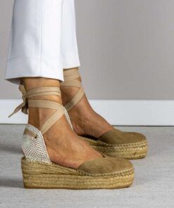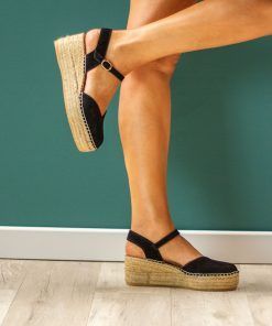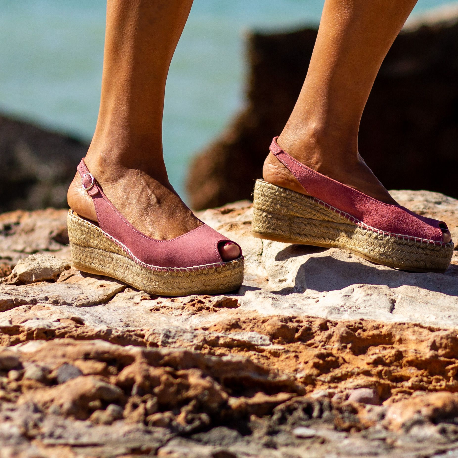 Alpargata con cuña elaborada en serraje. Suela vulcanizada de yute teñido y caucho, forrada con microfibra y plantilla de látex, ofreciendo mayor confort al caminar. Altura de 6 cm, cuña de 3 cm y plataforma de 3 cm. Hechas totalmente a mano en España.