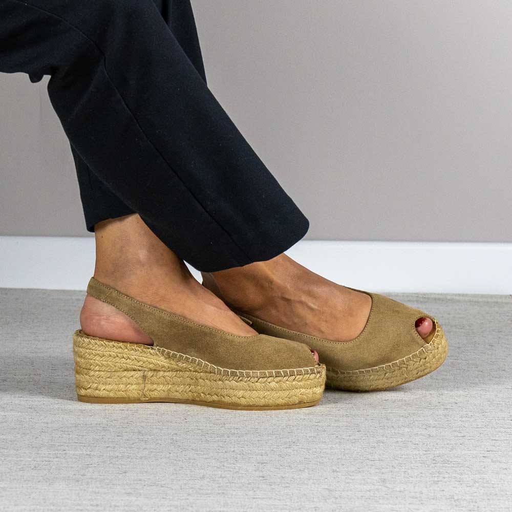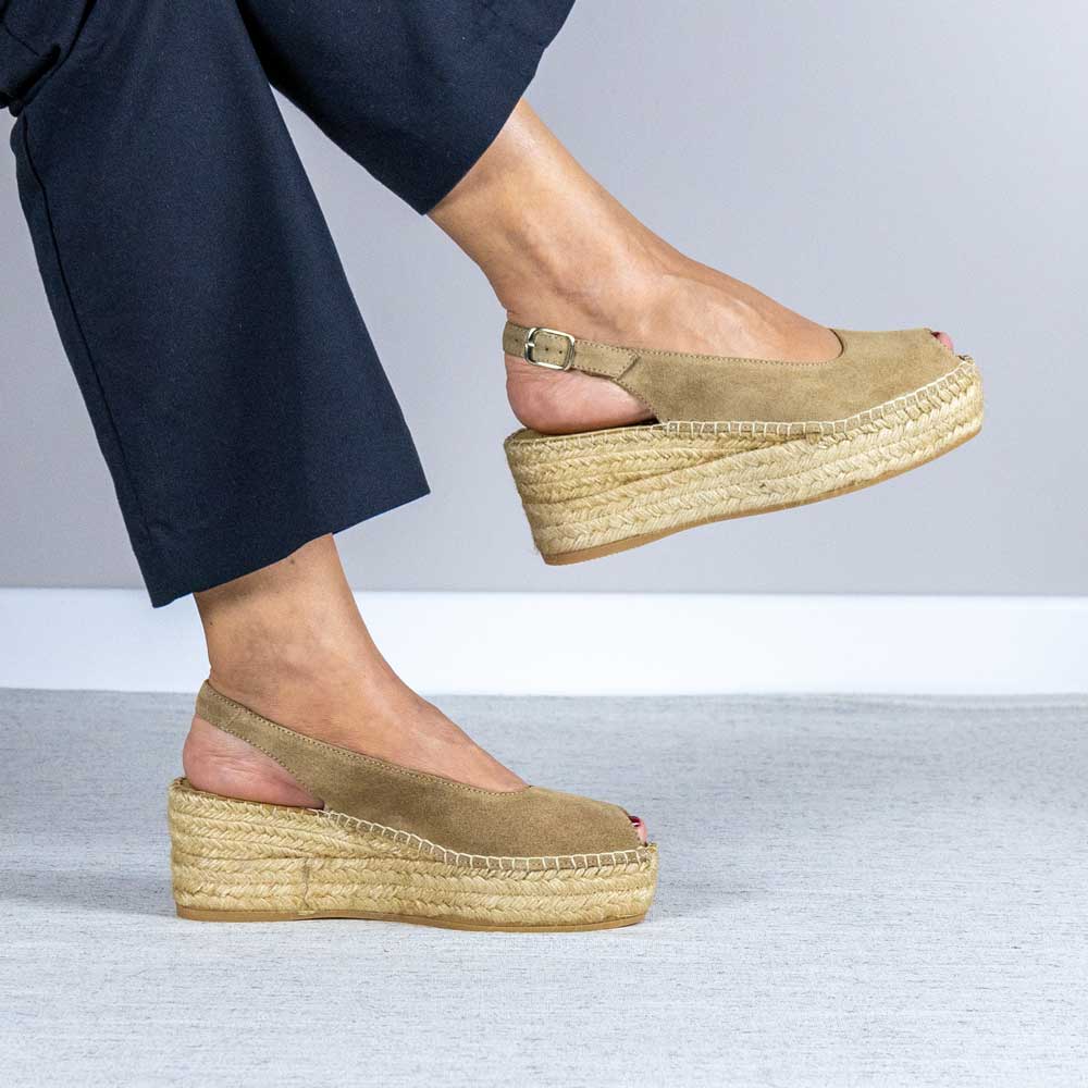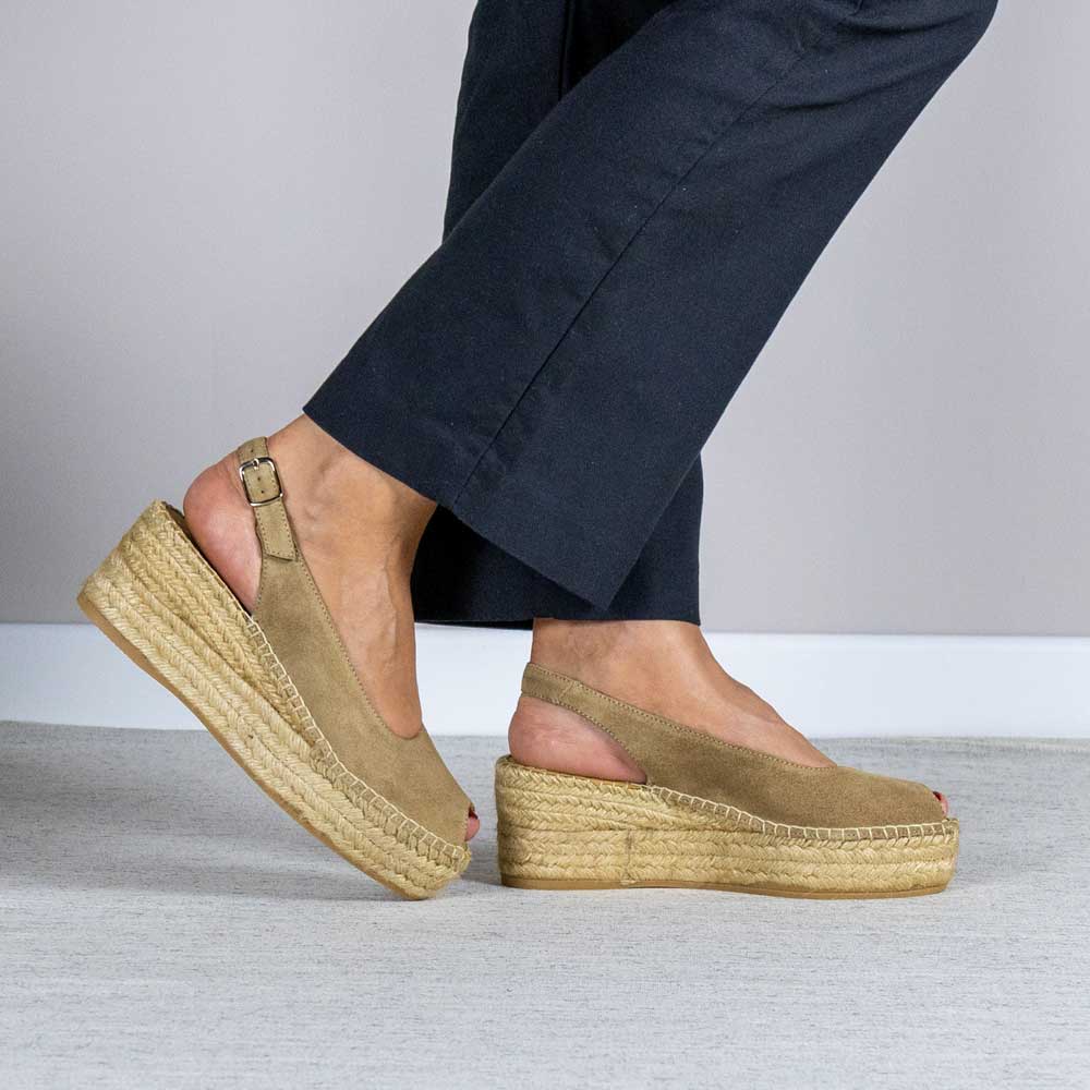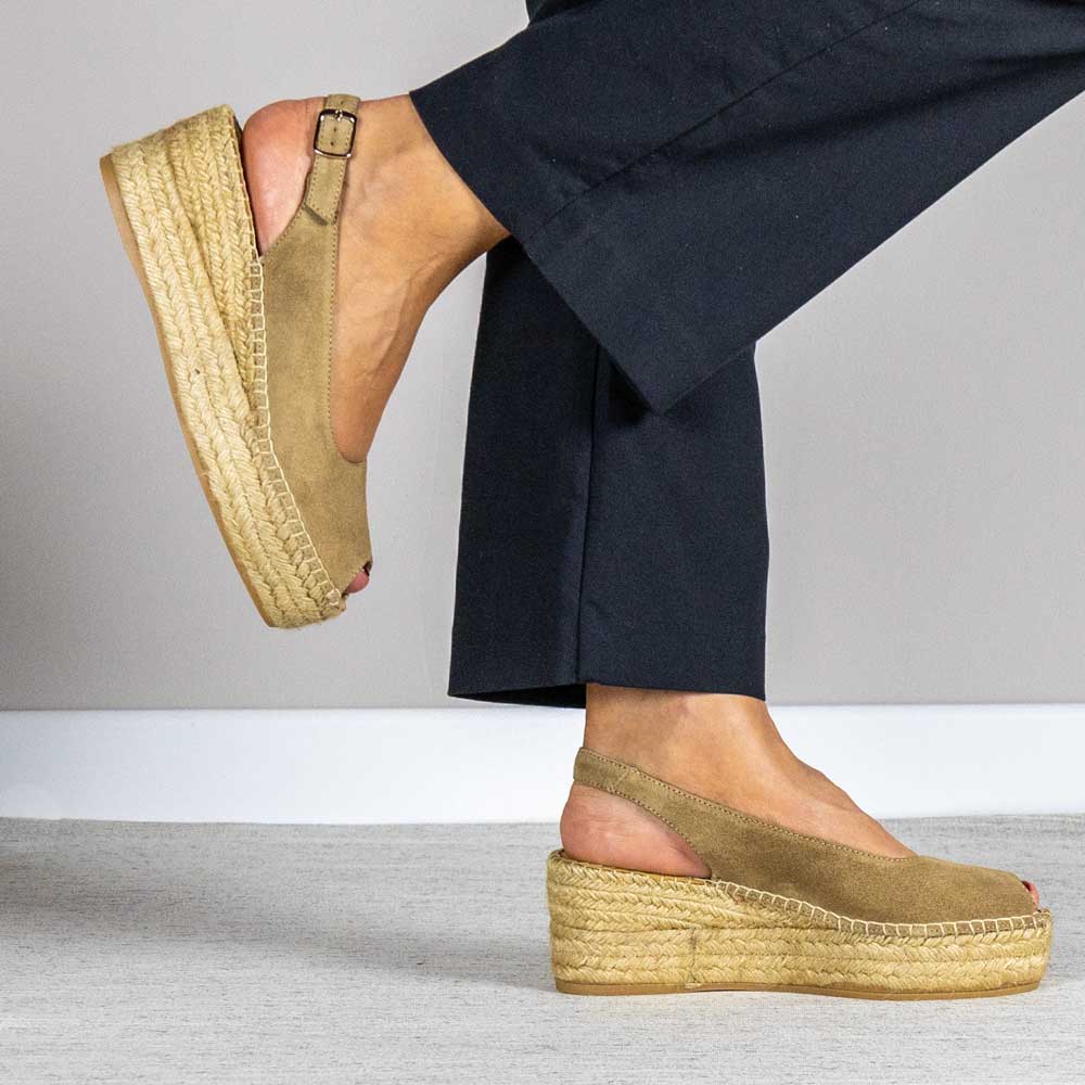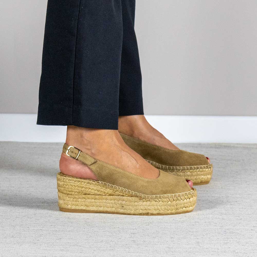 Alpargata con cuña elaborada en serraje. Suela vulcanizada de yute teñido y caucho, forrada con microfibra y plantilla de látex, ofreciendo mayor confort al caminar. Altura de 6 cm, cuña de 3 cm y plataforma de 3 cm. Hechas totalmente a mano en España.