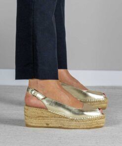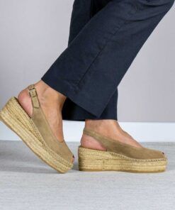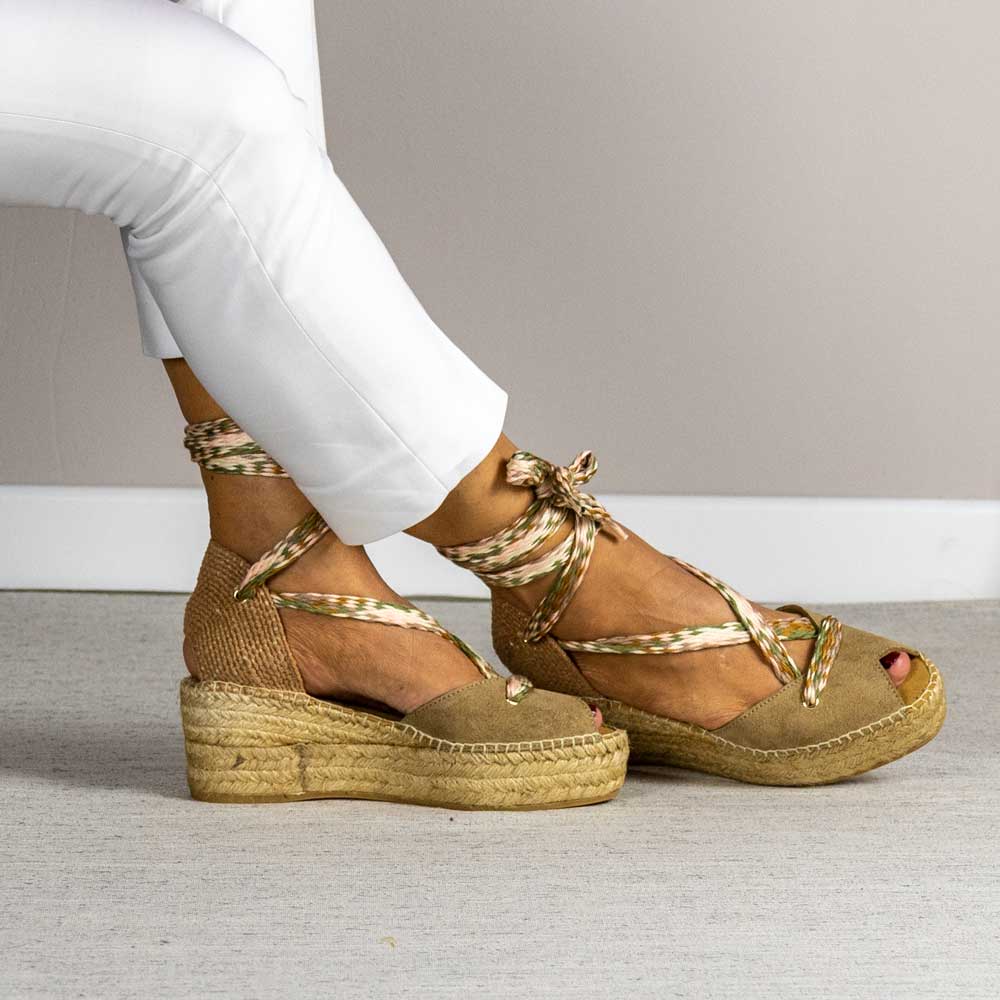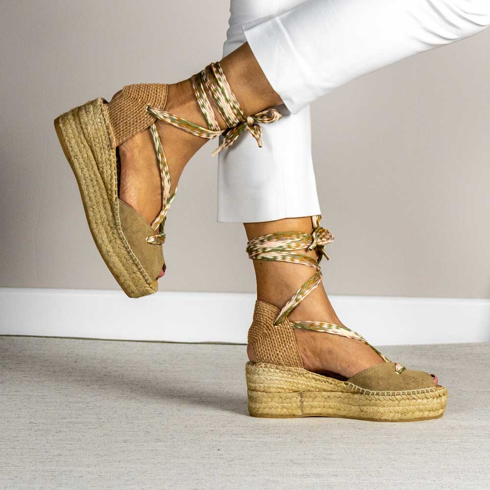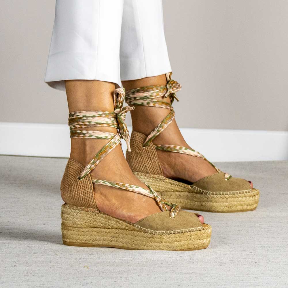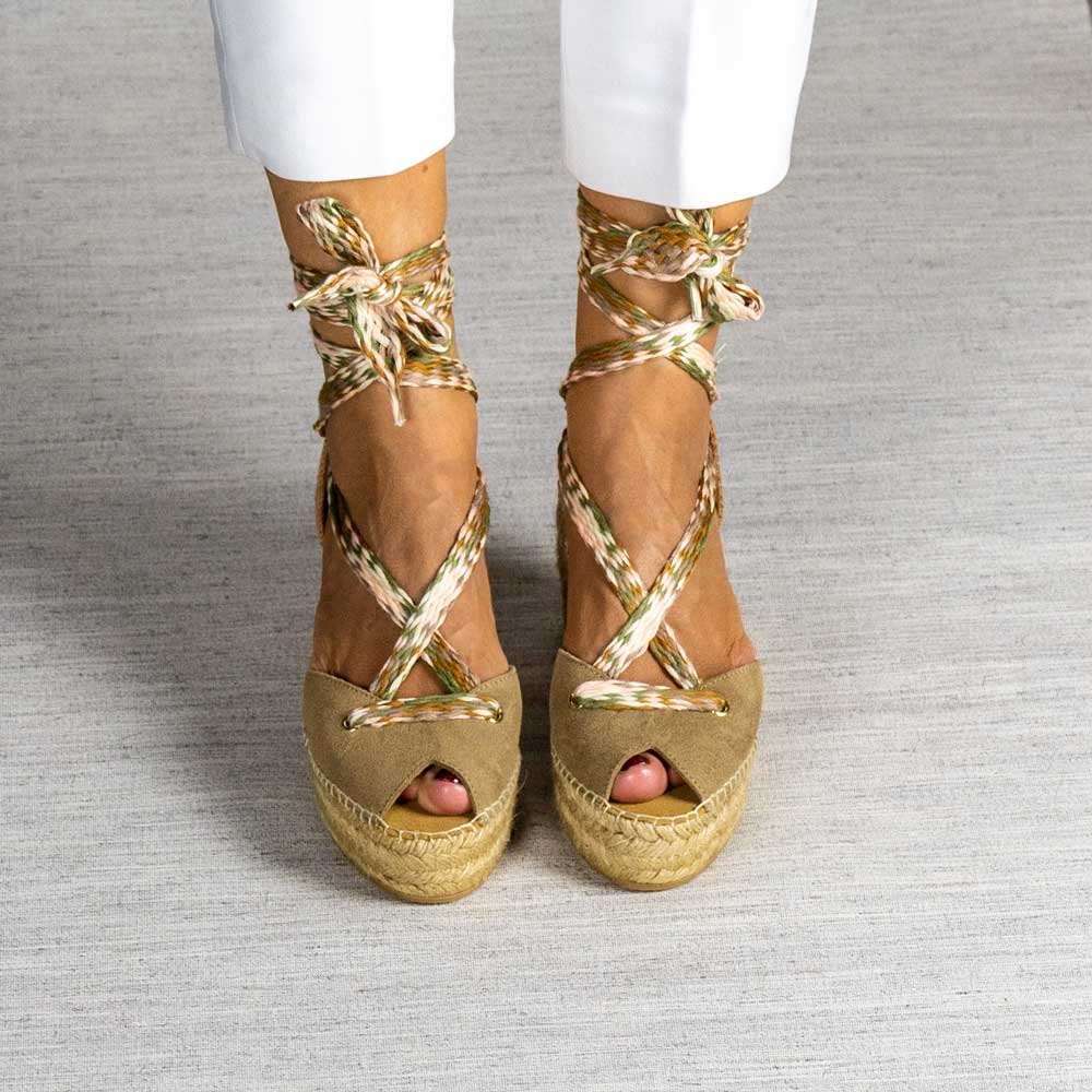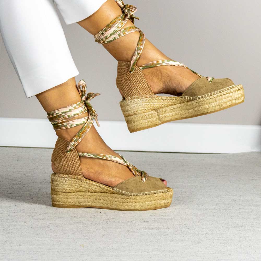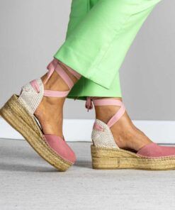 Alpargata con cuña elaborada en serraje. Talonera de tejido trenzado, y forrado para mayor resistencia y mayor comodidad ya que evita las arrugas en el talón. Cierre con cintas . Suela vulcanizada de yute teñido y caucho, forrada con microfibra y plantilla de látex, ofreciendo mayor confort al caminar. Altura de 6 cm, cuña de 3 cm y plataforma de 3 cm. Hechas totalmente a mano en España.